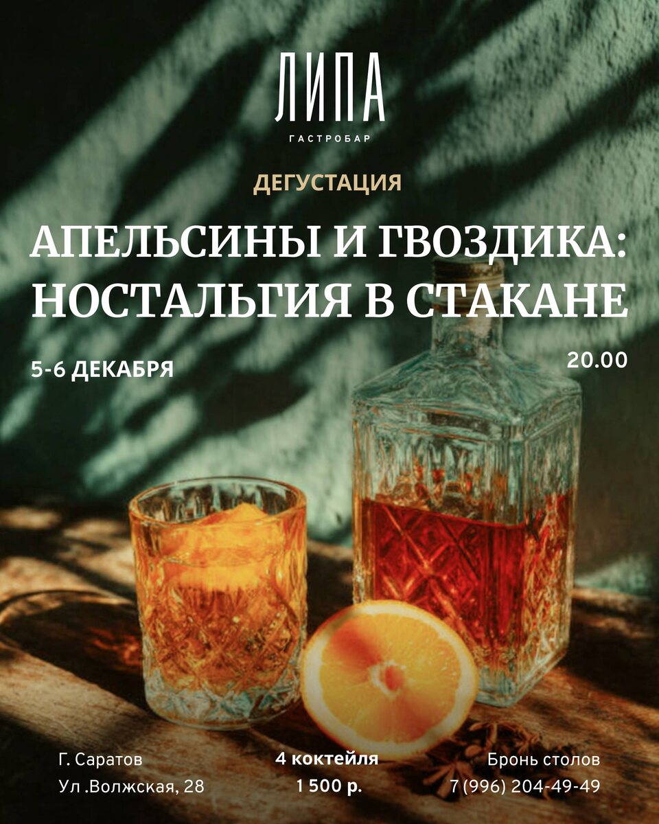 «Апельсины и Гвоздика: Ностальгия в стакане» В Липе декабрь начинается с ароматов, которые узнаёшь с закрытыми глазами: мандарины, гвоздика, лёгкая игристость и тёплый чайный акцент. Это вечер про ту самую новогоднюю ностальгию — только поданной в современном, авторском прочтении. 4 коктейля — 1500 ₽ 🕖20:00 Бронь столов: +79962044949 Липа ждёт, чтобы погрузить вас в атмосферу зимнего детства, но уже во взрослом, вкусном формате 🌿💛
