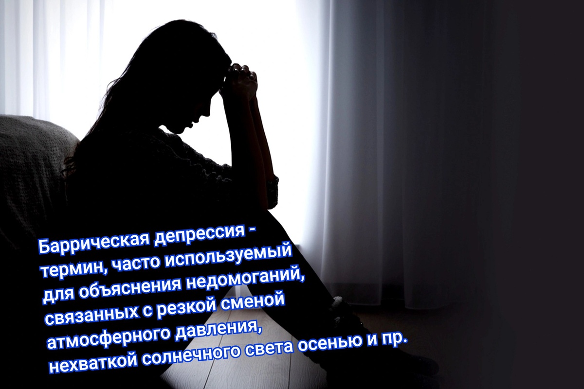 Депрессия. Её разновидность баррическая и сезонная депрессия. Депрессия - это длительное психическое расстройство, основными признаками которого являются сниженное (угнетённое, тревожное, боязливое или безразличное) настроение, утрата способности получать удовольствие от жизни, неспособность выполнять повседневные дела, отягощенная чувством вины и низкой самооценкой. То, что сегодня ничего не хочется делать, нет аппетита, хочется плакать и кому-нибудь пожаловаться на жизнь, а завтра в планах пойти на концерт известного исполнителя, и вы заскакиваете на минутку в магазин выбрать кофточку - это не она. ПРИЗНАКИ депрессии основательные, особенно заметен переход от нормального состояния к подавленному в сезонную (или баррическую) депрессию, они лишают человека воли и веры в себя, выжимают его как лимон и буквально парализуют желания. Абсолютная нерешительность, нарушение концентрации внимания, абулия, психомоторная заторможенность или, наоборот, необъяснимое возбуждение (тревожность и нево
