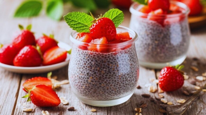 Разомните 3-4 ягоды, смешайте с чиа, медом и молоком. Охладите и подавайте со свежей клубникой. Лимонно-черничный