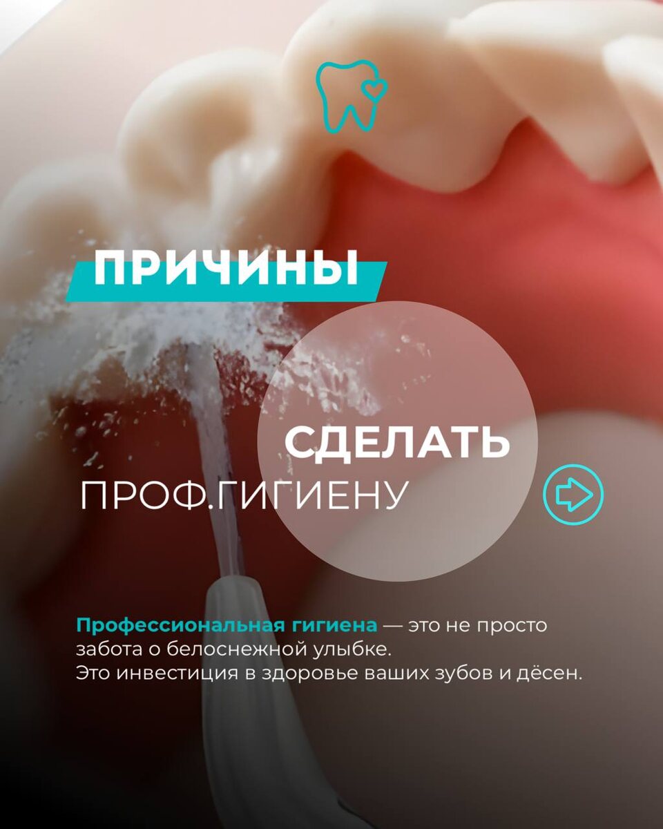 Вы заботитесь о своей улыбке? Тогда профессиональная гигиена — это именно то, что вам нужно! ⠀ Каждый из нас сталкивается с образованием пигментированного налёта и зубного камня, которые НЕВОЗМОЖНО удалить только с помощью домашней гигиены. Профгигиена — это не просто очищение, а комплексная ☝️ процедура, которая возвращает вашим зубам сияние и здоровье! ⠀ Расскажем подробней: 1️⃣ На процедуре мы используем современные ультразвуковые технологии и щадящие порошки под напором воды, которые позволяют безопасно и эффективно удалить налёт и камень с всех поверхностей зубов, даже в самых труднодоступных местах и под десной. 2️⃣ После этого зубы будут отполированы профессиональными пастами, которые не только придают блеск, но и предотвращают образование налёта и кариеса!⠀ 3️⃣ Но это еще не всё! Во время профессиональной чистки наш опытный доктор выявит возможные проблемы, такие как скрытые кариозные полости, состояние пломб и здоровья дёсен, что позволит предотвратить серьезные заболевания в