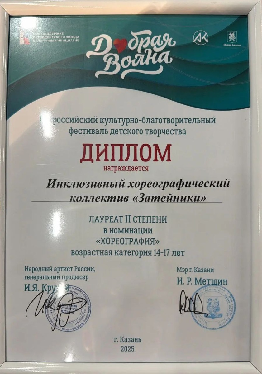 С радостью сообщаем о блестящем выступлении нашего хореографического коллектива "Затейники" на фестивале "Добрая волна"! Ребята продемонстрировали высочайший уровень мастерства и получили заслуженное признание, став Лауреатами второй степени. В качестве награды коллектив получил денежный приз, который, несомненно, станет стимулом для дальнейшего развития. "Добрая волна" – это не просто конкурс, а по-настоящему значимое событие, которое проводится с 2017 года. Его главная цель – дать возможность проявить себя талантливым детям и подросткам, которые столкнулись с жизненными трудностями или имеют особенности здоровья. Фестиваль основан по инициативе Мэра Казани Ильсура Метшина и известного композитора Игоря Крутого. Масштаб мероприятия подчеркивается поддержкой со стороны Президентского фонда культурных инициатив и Правительства Республики Татарстан. Организаторами этого замечательного проекта выступают Академия Популярной Музыки и Мэрия Казани. Мы гордимся нашими "Затейниками" и желаем