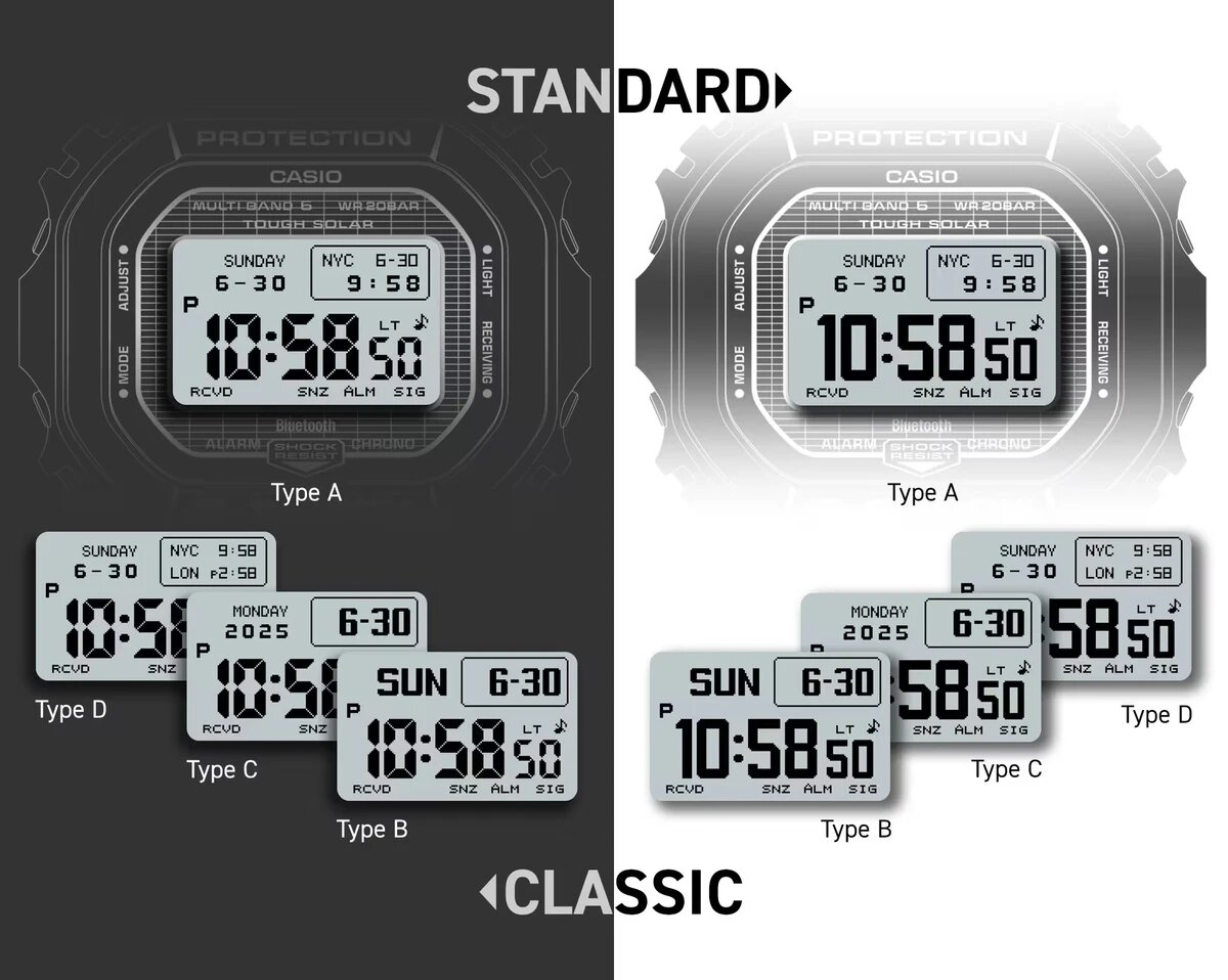 Компания Casio вновь возвращается к истокам, переосмысливая легендарную «квадратную» серию 5600 — и делает это с футуристическим подходом. Новая модель GW‑BX5600 сохраняет культовый дизайн, знакомый поклонникам серии с эпохи первых часов, но при этом наполняет его современными технологиями, отвечающими высоким требованиям сегодняшнего дня. Новый дисплей — шаг вперёд Главной инновацией стал дисплей MIP‑LCD (Memory‑in‑Pixel), впервые применённый в корпусе классической 5600‑й серии. Такой экран обеспечивает высокую контрастность, отличную читаемость под углом и при ярком солнечном свете — то, чего многим не хватало в старых моделях с традиционными STN‑экранами. Пользователь может выбирать между двумя стилями шрифта — «Classic» (имитация ретро‑сегментов) и современным «Standard» — и переключаться между четырьмя режимами отображения времени/даты, подстраивая интерфейс под себя. Гибрид прочности, надёжности и современных функций GW‑BX5600 объединяет в себе проверенные временем «костяки» с