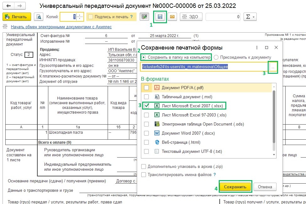 Как выгрузить документ из 1С в Excel 📁📊 Любой документ из 1С можно сохранить в табличном формате. Для этого в 1С Бухгалтерия предприятия 3.0 выведите документ на печать и нажмите на дискету для сохранения 💾 Выберите вариант "Сохранить на диск", по кнопке с тремя точками️ определите, в какую папку сохранить документ, галкой отметьте формат xlsx и нажмите кнопку "Сохранить". Инструкция со скриншотами как всегда в доступе в нашем самоучителе 📚 → https://scloud.ru/ask_question/obshchie-voprosy/kak-sokhranit-dokument-v-excel-v-bp-3-0/ Аналогично можно сохранять не только документы, но и отчеты 📑 и даже списки из 1С 📋. Подробнее в инструкции 📖 → https://scloud.ru/ask_question/obshchie-voprosy/sokhranenie-dokumentov-otchetov-reestrov-na-kompyuter-iz-bp-3-0/ Читайте Scloud в телеграм-канале: https://t.me/+v_De7-FUiXU4YTQ6