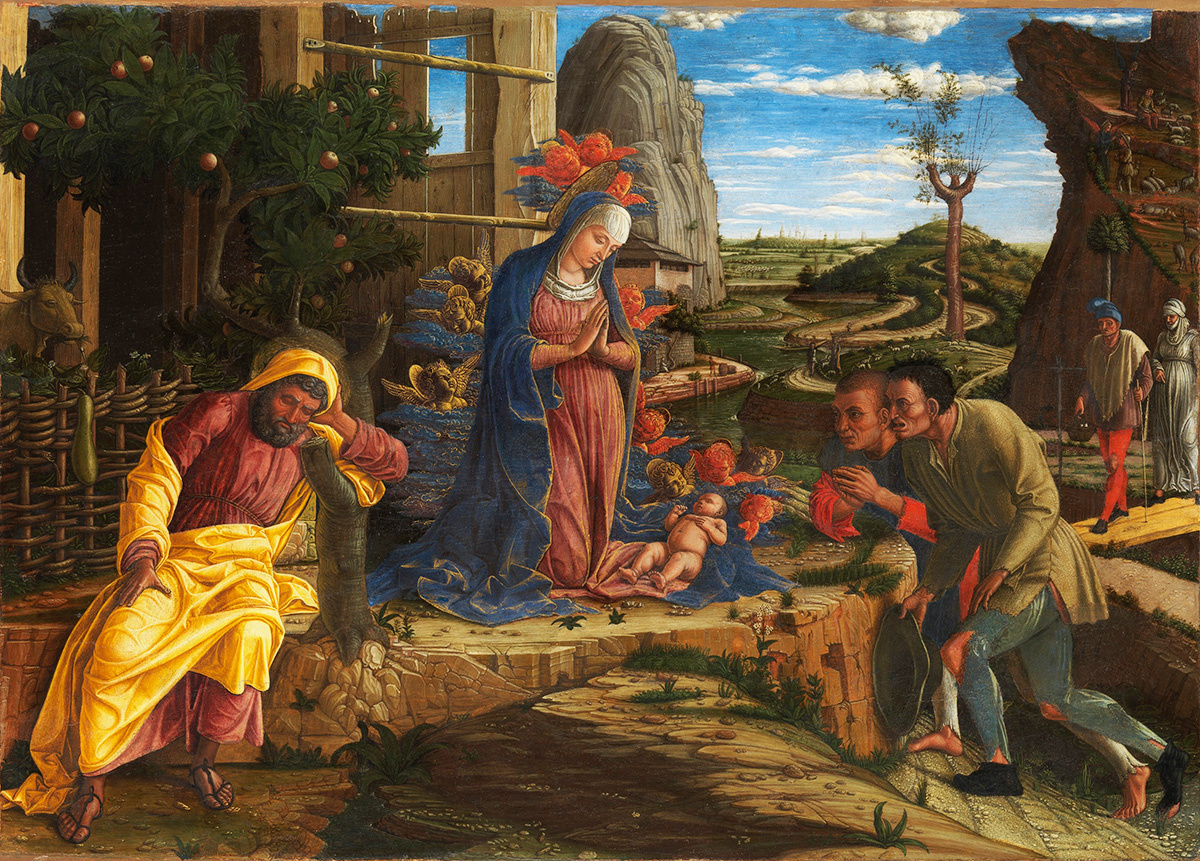 «Поклонение пастухов», предположительно, было завершено, когда Андреа Мантенья (ок. 1431-1506) работал над фресками из жития Святого Иакова. Это небольшая (37,8 x 53,3 см) картина, вероятно, была заказана Борсо д’Эсте во время пребывания художника в Ферраре в 1450 году. На ней изображено открытое пространство, в центре которого расположена Мадонна, преклоняющая колени перед Младенцем Христом на каменной ступеньке. Справа от неё Иосиф спит после утомительного путешествия, а слева — два пастуха склонились в молитве. Фигура спящего Иосифа, облачённого в яркий жёлтый плащ, возможно, намекает на его роль лишь хранителя Девы Марии с Младенцем. Он прислонился к обожжённому дереву, на единственной ветке которого появились плоды, символизирующие мистическое обновление природы. Слева мы также видим огороженный фруктовый сад, символизирующий девственность Марии, а также разрушенный хлев, в котором родился Иисус. Рядом с которым стоит вол, традиционный безмолвный свидетель Рождества. Правую