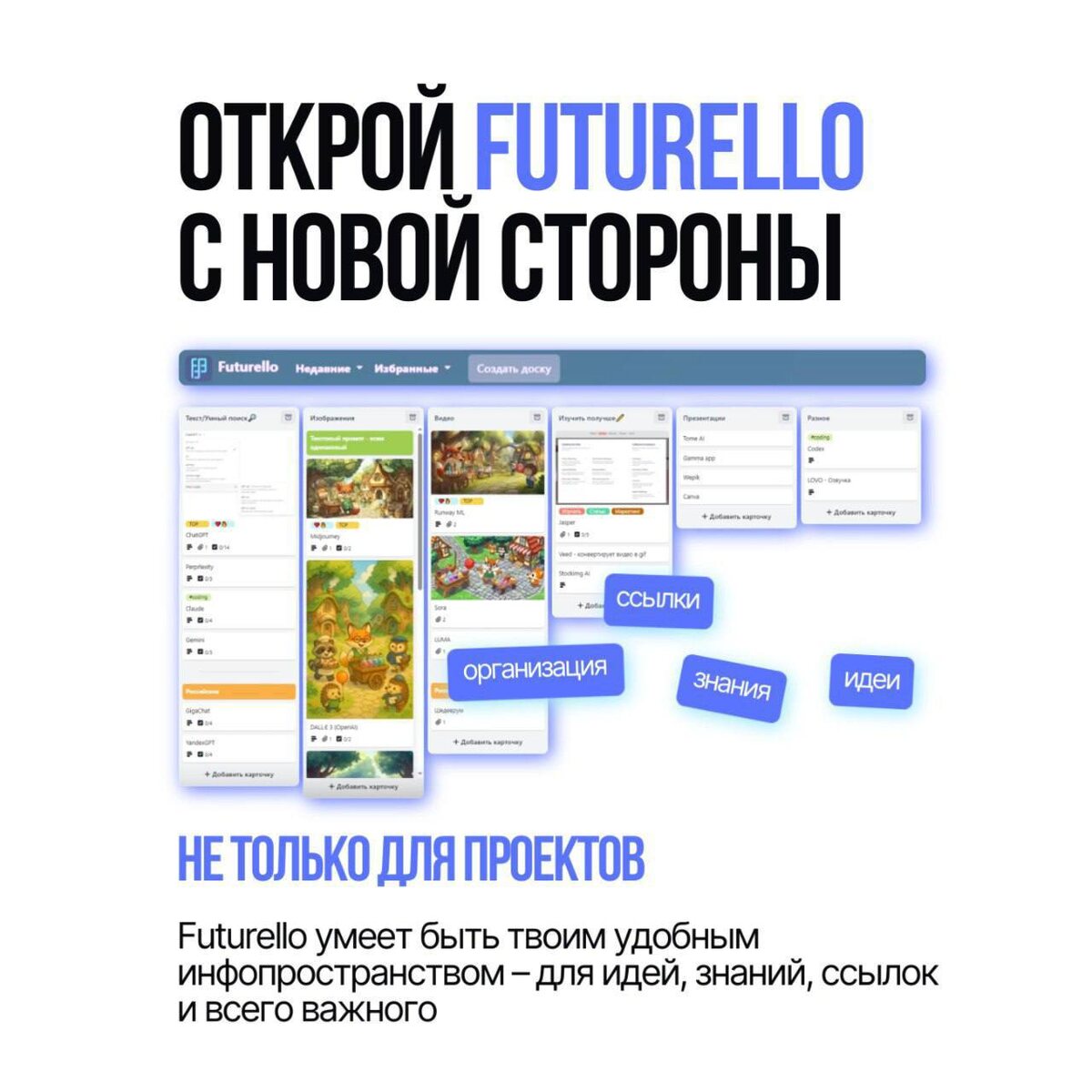 Мы привыкли использовать Futurello как проектную доску: общаться со смежниками, следить за сроками, обсуждать решения. Но сегодня другой сценарий. Futurello может быть информационным пространством, где удобно хранить всё важное по любой теме 🤩 Листай карточки👆🏻в них мы показали идею пошагово. А если удобнее с видео приятного просмотра!