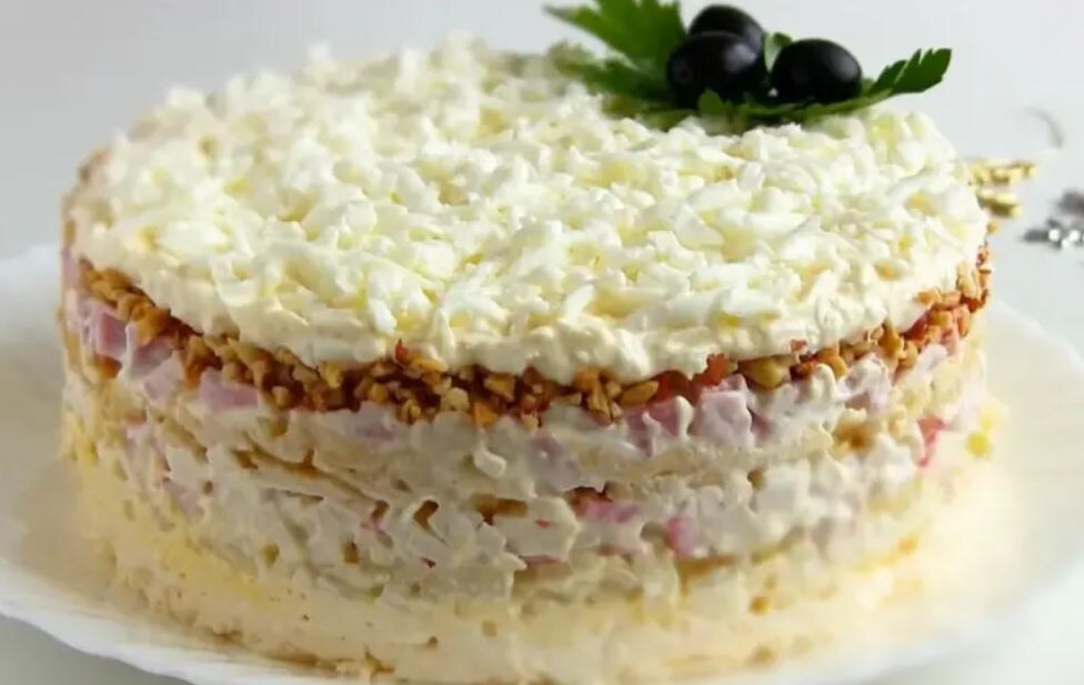 Когда режешь такой салат порционным кусочком, в нем видно все эти разноцветные слои. Во вкусе тоже чувствуется эта многослойность: нежность сырка и желтков, солоноватость ветчины и крабовых палочек, хруст лука и арахиса, свежесть яблока. Он действительно получается сочным, но без лишней влаги, и очень сытным. Исчезает он со стола одним из первых, что, на мой взгляд, и есть лучшая оценка для любого домашнего рецепта. Это не волшебство, а просто удачная и проверенная комбинация, которая работает. Попробуйте собрать такую «Снежную Королеву» — возможно, она станет и вашей надежной новогодней классикой.