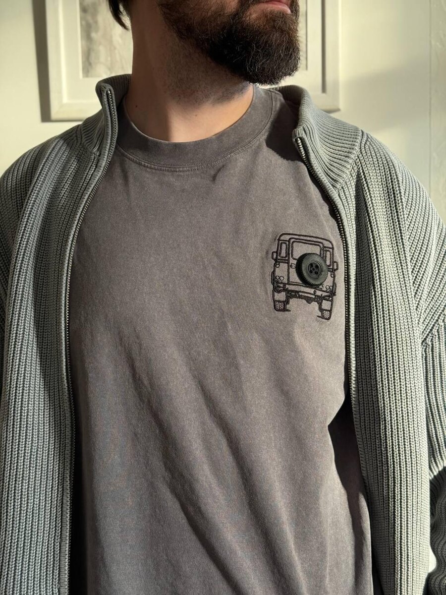 Иван Майт продолжает свои опыты по встраиванию машин в футболки, на этот раз просто гениальных ход с пуговицей в виде запаски, как я сам до этого не додумался, ну и вышивка конечно, чтоб побогаче смотрелось. Кайф, нравится.