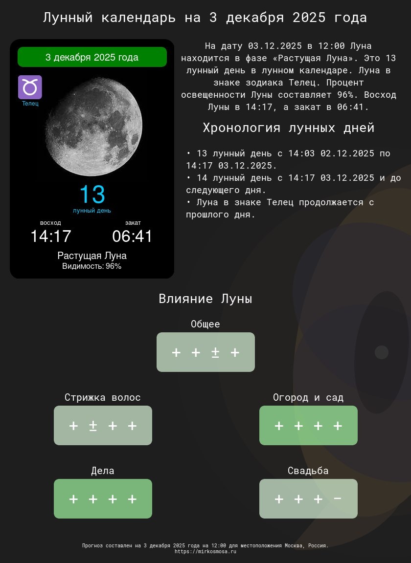Лунные календари на 3 декабря 2025 года: Подготовьтесь к этому дню с учетом влияния Луны! 🔹🌗 Лунный календарь на 3 декабря 2025 года — Что приготовила Луна? Подробнее 🔹✂️ Лунный календарь стрижек на 3 декабря 2025 года — Подходящий ли день для обновления прически? Подробнее 🔹🌱 Лунный календарь огородника и садовода на 3 декабря 2025 года — Лучшее время для ухода за растениями. Подробнее 🔹📅 Лунный календарь дел на 3 декабря 2025 года — Удачные моменты для важных задач. Подробнее 🔹💍 Лунный календарь свадеб на 3 декабря 2025 года — Подходит ли этот день для вашего торжества? Подробнее