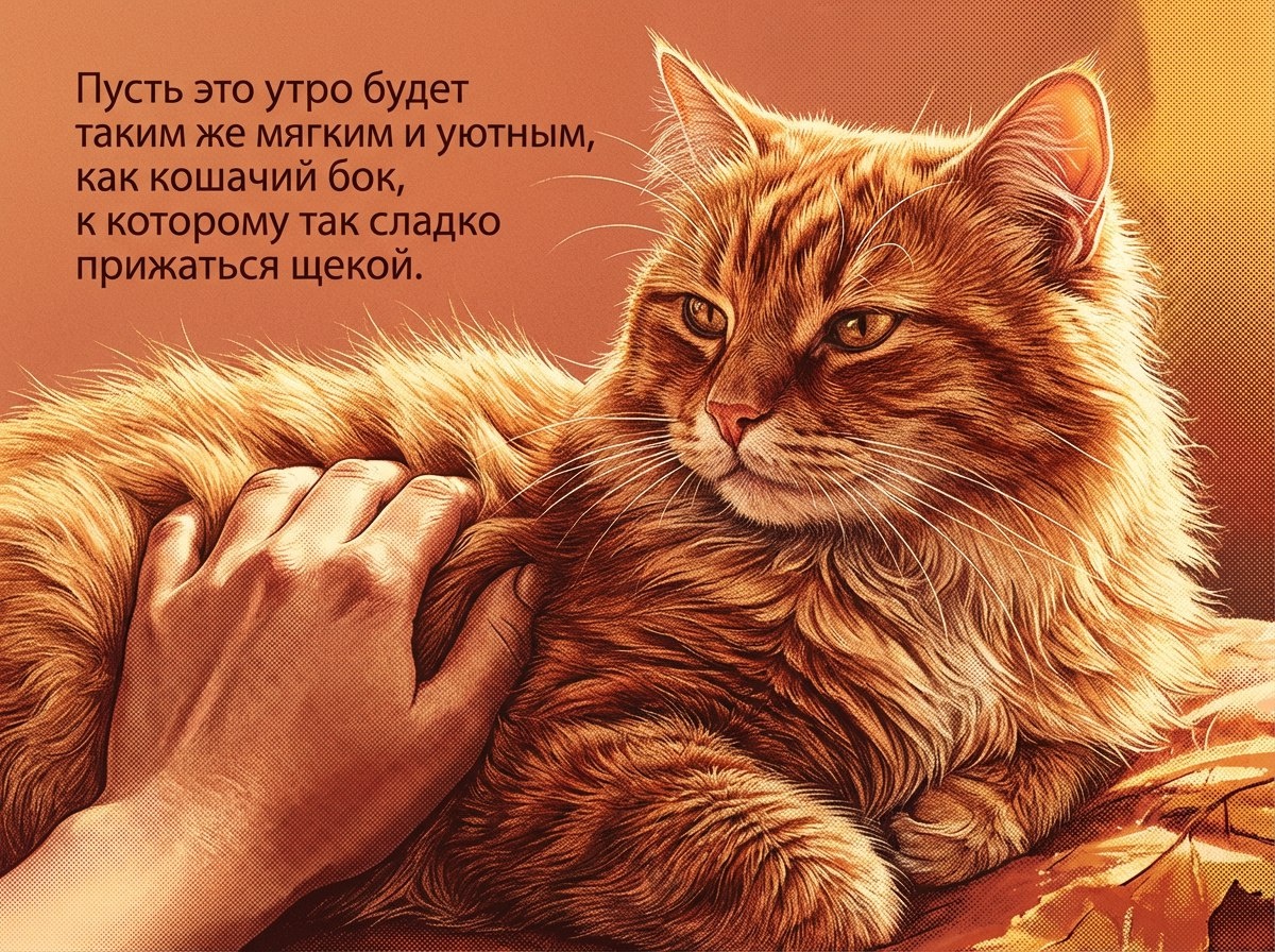 С добрым утром, человек. Пусть это утро будет таким же мягким и уютным, как кошачий бок, к которому так сладко прижаться щекой. Как и я, твой внутренний котик, позволь себе сегодня быть немного ленивым, нежиться в лучах начинающегося дня и мурчать от предвкушения маленьких радостей. Прислушайся к своей интуиции, она подскажет, где спрятано самое тёплое местечко и самая интересная тропинка. Каждый новый день — это как чистый, нетронутый коврик, на котором можно оставить свои следы, играя и познавая мир. Будь грациозен в своих движениях и мыслях, сохраняй спокойствие и уверенность, зная, что ты всегда приземлишься на лапки. Пусть твой день будет полон тепла, света и тихой, умиротворяющей радости.