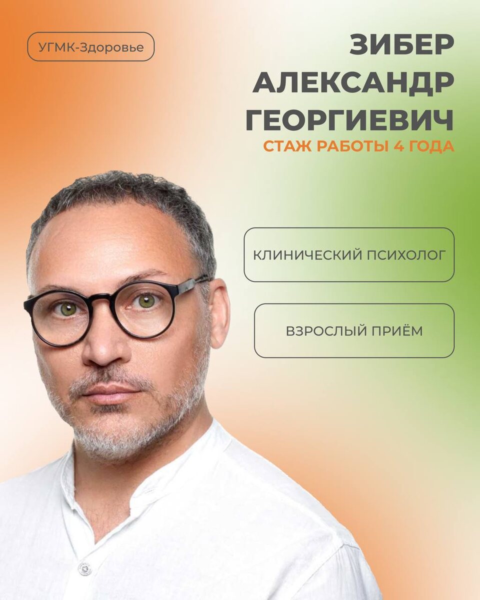 Знакомимся со специалистом В клинике «УГМК-Здоровье» ведёт приём клинический психолог Зибер Александр Георгиевич. Направления работы специалиста: 🟢Личностно-ориентированная психотерапия, динамическая психотерапия. 🟢Эриксоновский гипноз. 🟢Экспериментально-психологическое исследование познавательных процессов личности у взрослых. С какими жалобами стоит обратиться: 🟡Чувство тревоги, хронический стресс, раздражительность, кризисный период. 🟡Эмоциональная нестабильность, сложности с управлением эмоциями, вспышки агрессии. 🟡Низкая самооценка, неуверенность в себе. 🟡Трудности в самоконтроле, проблемы в отношениях, сложности в коммуникации. 🟡Психологическая усталость, выгорание, стресс. 📍Приём ведётся по адресу: ул. Уральская, 52А, Центр психотерапии и психиатрии «УГМК-Здоровье». Записаться можно по телефонам: 📞 +7 343 283 08 08 (доб. 0) 📱WhatsApp центра +7 912 210 61 97 или на сайте.