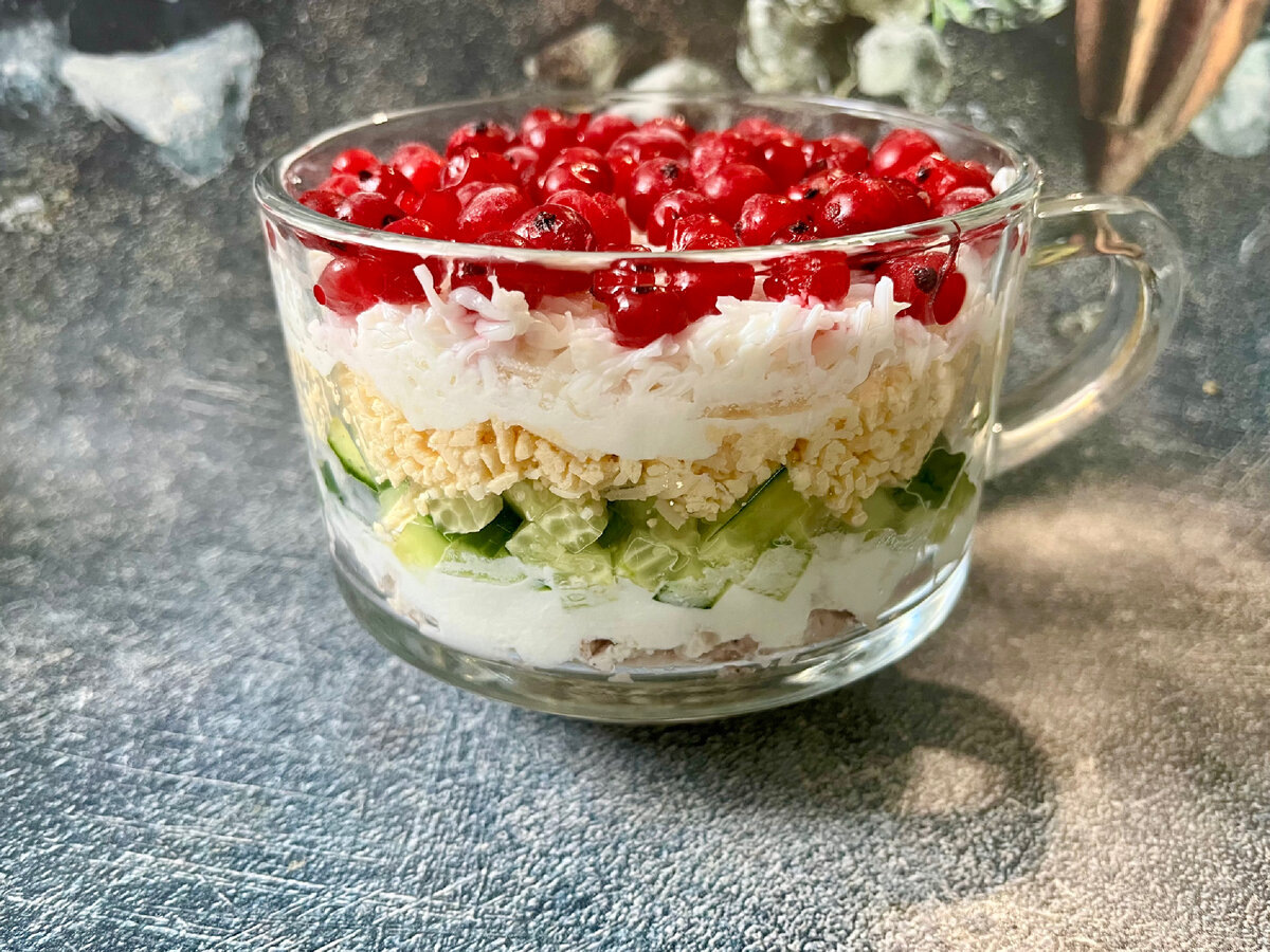 Привет, привет 👋 всем!!! Сегодня делюсь рецептом отличного салата для тех, кто следит за питанием. Он богат белком, малокалориен (всего 104 ккал на 100 г) и прекрасно подходит для ужина. Девчата, конечно я худела не только на этом салате. У меня был балансированный рацион. Но этот салат входит в мое меню стройности. Почему «королевский»? Название, на мой взгляд, скорее связано с эффектной подачей: белые слои (белки, йогурт) контрастируют с красными элементами (смородина или гранат). При этом ингредиенты вполне обычные — никакой экзотики! Важные нюансы Салат собирается слоями — можно оформить в кольце или просто в миске. Готовится быстро, но лучше подавать сразу: огурцы могут дать сок. Я минимизирую соль, поэтому добавляю сыр для вкуса. Если вы солите блюда, можно обойтись без него. 1. Готовим курицу Я, как обычно, приготовила в бумаге на сковороде. Нарежьте филе пластинами толщиной 1,5 см. Обмажьте специями и солью (можно замариновать в соевом соусе, горчице или мёде). Заверните в б