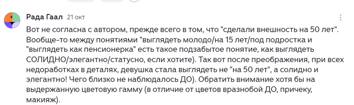 Знаете, очень часто в комментариях под разными статьями я вижу сакральную фразу о какой-то солидности женщины. И не всегда эту самую солидность я понимаю. Для понимания того, о чем я говорю: девушке на фото 30 лет. И вот такой комментарий получило ее преображение от стилистов Модного приговора. Раньше девушка носила яркую одежду, светлые пушистые волосы и броские украшения. А теперь - это. И это люди называю солидностью. И это несколько обескураживает меня. Вот другой комментарий. Тут уже про статусность. Но все это - к этой же статье. И к этой же девушке.