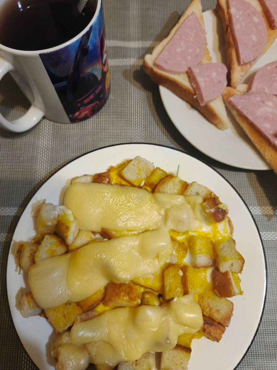 Здравствуйте! Видите зиму? Нет. А она есть. Третий день зимы не радует ничем. В связи с погодой и самочувствие не очень, причем заметили это все члены семьи. Плохой сон, какая-то апатия, у меня, так голова болела жутко, даже таблетки не спасали. Вот эта темень уже просто невыносима. Свет в квартире горит круглыми сутками. А на улице грязь по колено, наш город в принципе этим славится) Но вообще я хотела рассказать о другом, более приятно, а именно, что за планы вдруг поменялись, и к чему это привело. Как обычно, я в голове уже спланировала всю еду, включая ужин, и даже продумала время, когда буду готовить, вынула мясо из морозилки, чтобы после смены на работе приступить, но муж внес свои коррективы. Итак, на завтрак у меня и моего школьника было одно и то же блюдо: тостовый хлеб в яйце. Он очень просил приготовить именно его. Хлеб режу кубиком, поджариваю на сковороде и заливаю яйцами. Сверху несколько ломтиков сыра. Получается вкусно, поверьте. Ну, и еще бутерброды из тостов с колба