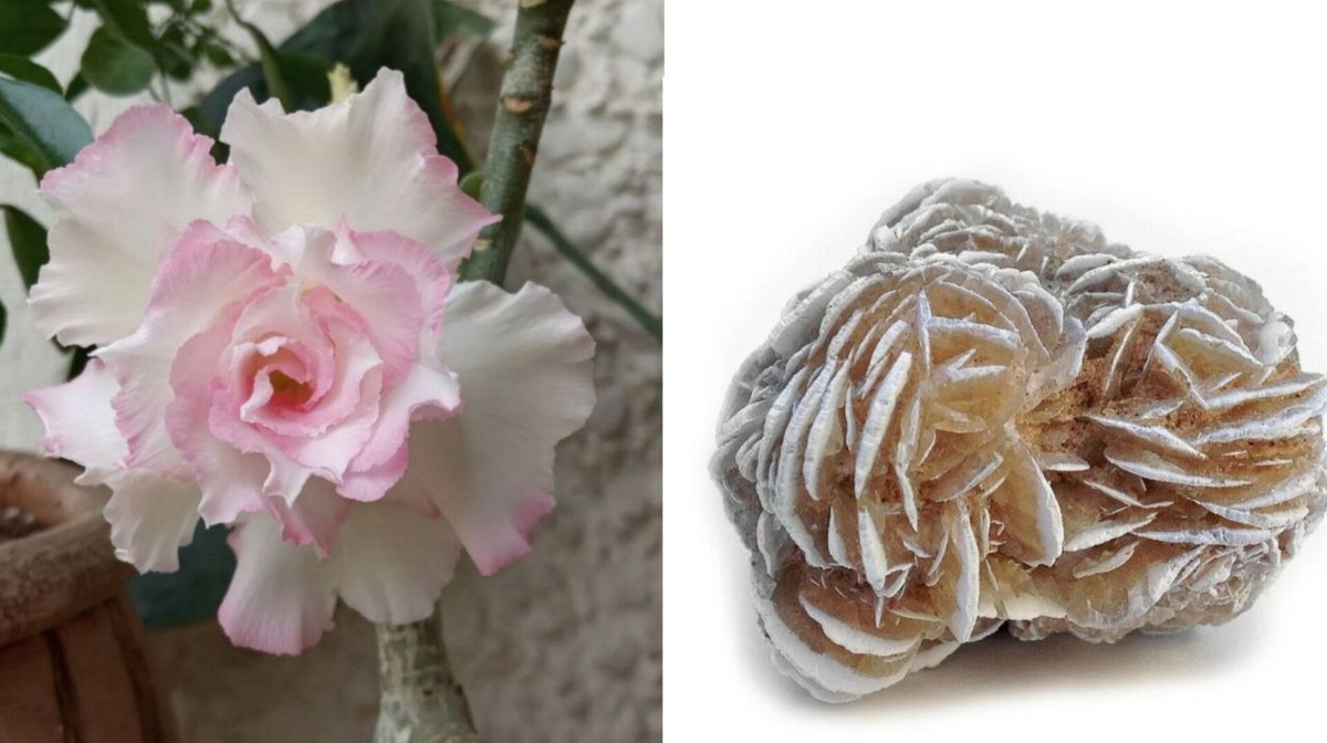 На фото 2 пустынные розы. Слева Адениум - комнатное компактное дерево, имеющее очень мясистый небольшой ствол. Справа - минерал "Роза пустыни", созданный пустыней, благодаря кристализации гипса и песка. Есть предположение, что в процессе участвует и кристаллизованная моча верблюдов. Не важно, из чего ты сделан, важно, что тебя ценят и любят именно за то, что ты вообще есть ❤️