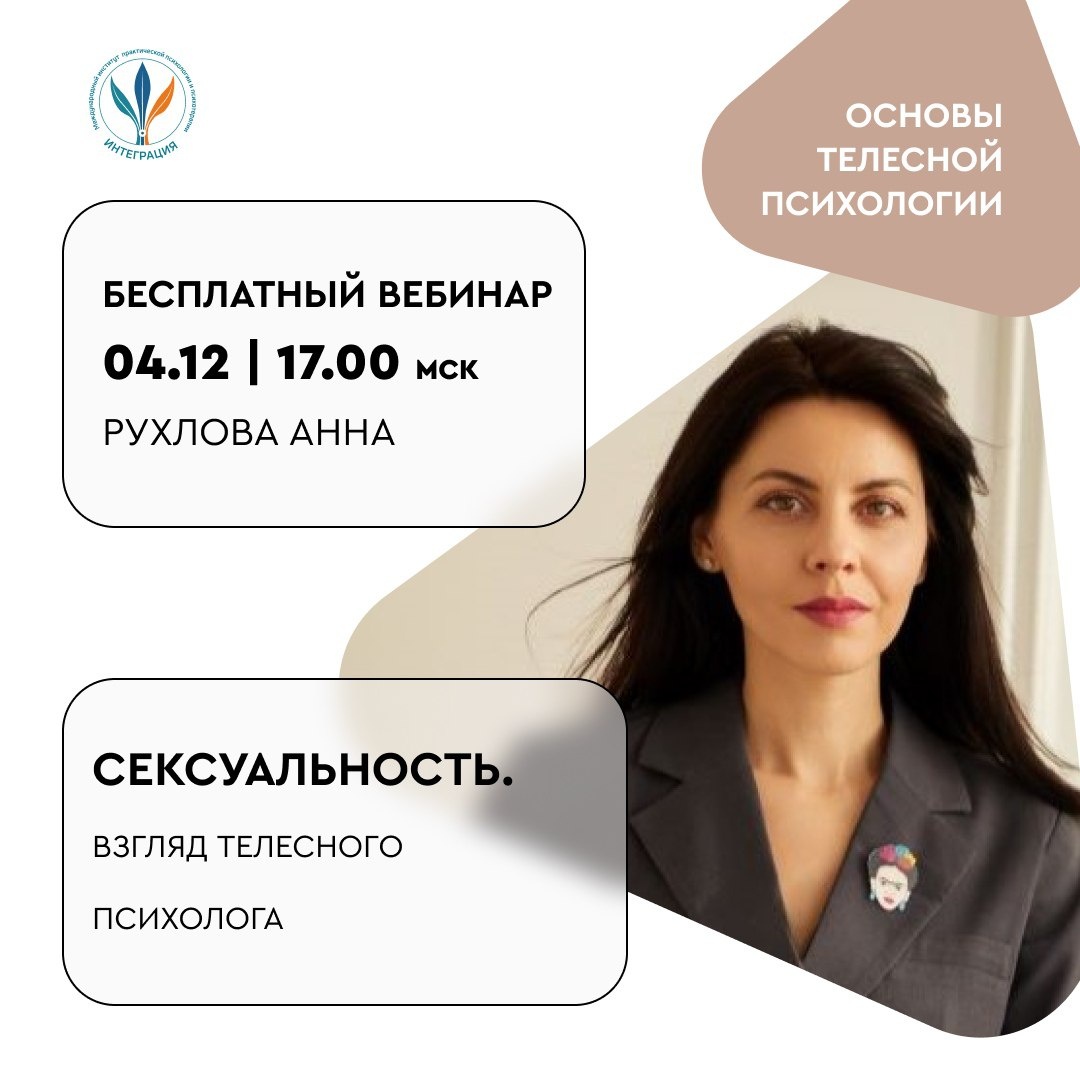 Сексуальность чаще всего воспринимают как интимную сферу, и, конечно, да, куда без нее. Но для телесного психолога сексуальность — это более широкое понятие, это про живость, ощущение тела, контакт с собой и способность чувствовать. Часто мы связываем сексуальность с внешней привлекательностью, но в теле она ощущается иначе, как энергия, движение, дыхание, присутствие. Когда тело зажимается, энергия замирает. Когда появляется пространство для чувств, возвращается вкус к жизни. 💻 На вебинаре «Сексуальность. Взгляд телесного психолога» поговорим о том: ❓ как формируется сексуальность; ❓ где теряется её естественность; ❓ что помогает вернуть контакт с телом, с собой, со своей внутренней живостью. Этот разговор не о технике и не о ролях. Он будет о чувственности, границах, доверии и свободе быть собой. 🗓🛎 4 декабря в 17:00 мск 🗣 Ведущая: Анна Рухлова, психолог, специалист в телесно-ориентированном подходе, магистр психологии и преподаватель института «Интеграция». ➡️ Регистрация