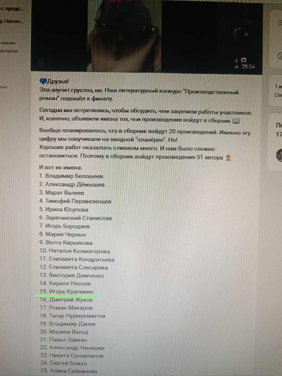 Вчера пришло письмо с новостью что мой рассказ в финале проекта "Производственный роман". В ВКонтакте объявила победителей известный писатель и организатор конкурса Майя Неверович. https://vk.com/wall-232438843_478 Снял мини видео этой трансляции где она озвучила мое имя. Когда выйдет в свет сборник финалистов с рассказами ещё не известно, работа над ним только началась, но точно не в этом году 📚