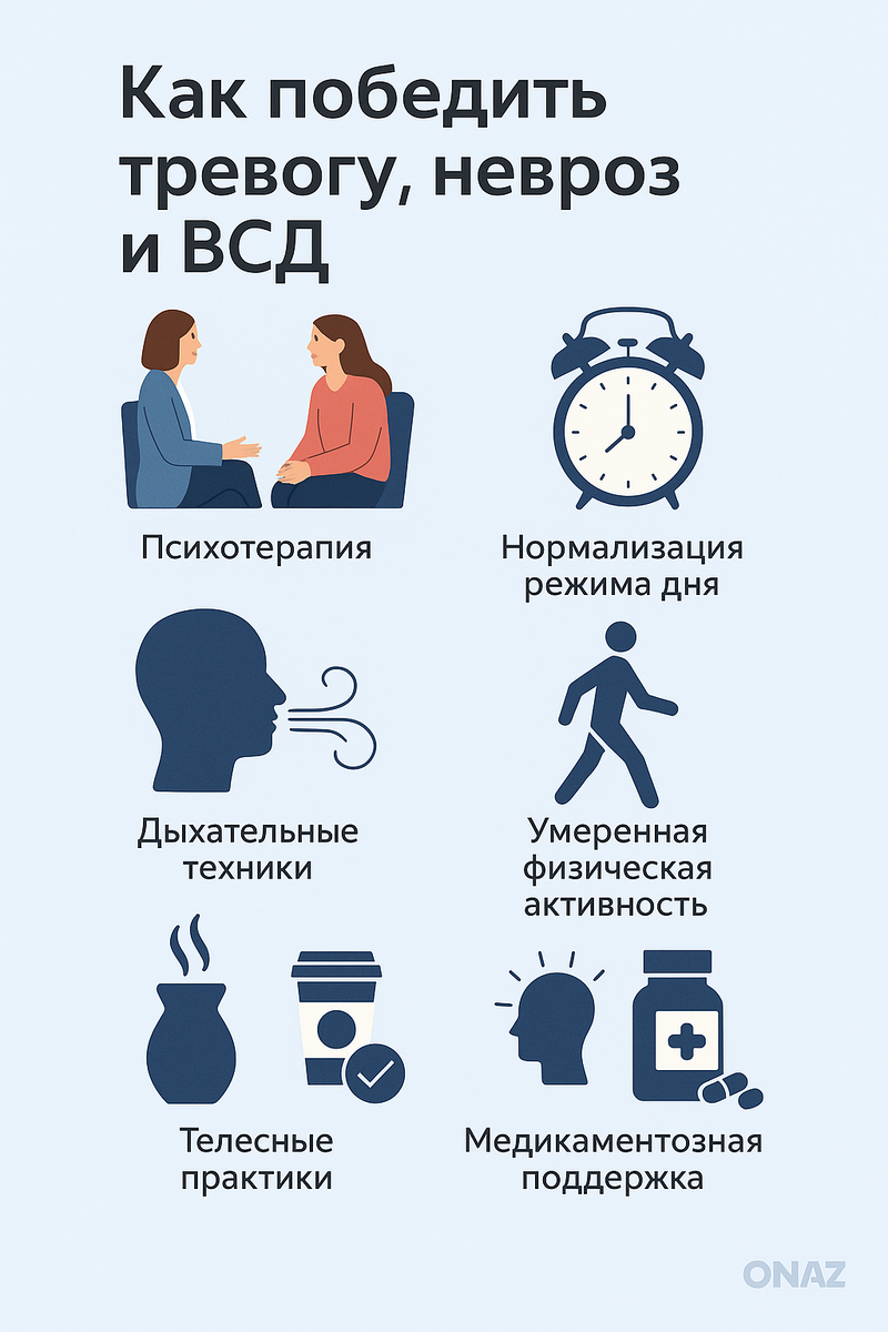 Тревога, невроз и ВСД — три состояния, которые часто идут рядом. Человек чувствует постоянное внутреннее напряжение, мучается от навязчивых мыслей, страдает от скачков давления, нехватки воздуха, бессонницы и бесконечной усталости. Хорошая новость: эти состояния обратимы, если использовать правильный подход. Ниже — проверенные методы, которые помогают большинству людей постепенно вернуть спокойствие и стабильность. Почему тревога, невроз и ВСД появляются одновременно Все три состояния связаны с работой вегетативной нервной системы. Когда нервная система перегружена — из-за стресса, выгорания, недосыпа или длительного напряжения — она начинает работать нестабильно. В результате возникают: скачки давления учащённое сердцебиение тревожные мысли панические реакции ощущение «кома» в горле проблемы с дыханием Чтобы победить симптомы, важно восстановить баланс нервной системы. Эффективные способы побороть тревогу, невроз и ВСД Это не «быстрые лайфхаки», а реальные работающие методы, которы