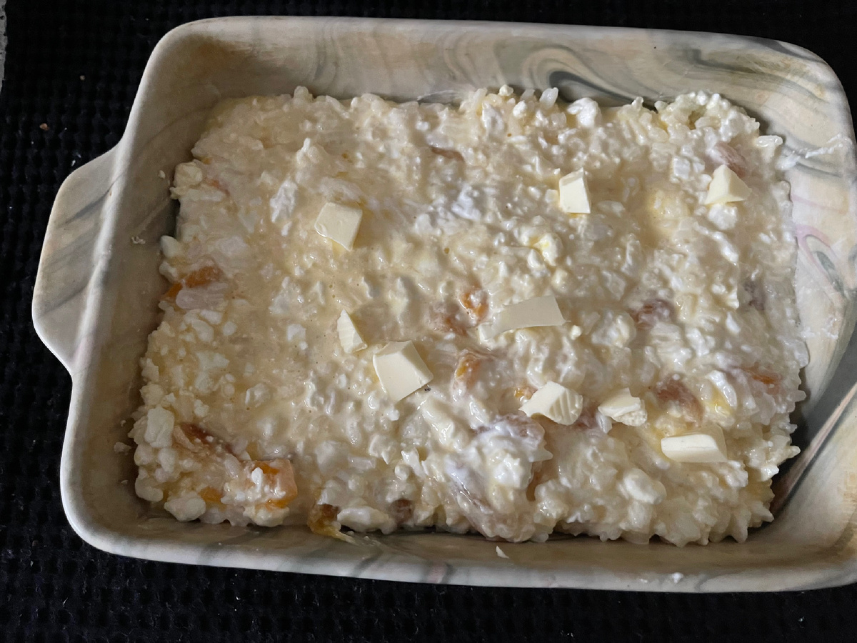 Ингредиенты: творог - 400 гр., 1/2 стакана риса, 50 - 70 гр.кураги, 3 яйца, 4 - 5 ст.ложек сахара или чуть больше или меньше - по вкусу, 3 ст.ложки натурального йогурта без добавок или сметаны, 30гр.сливочного масла . Приготовление: Отварить рис в подсоленной воде, затем остудить. Растереть творог с сахаром. Добавить в творог яйца и йогурт, перемешать. Соединить творожную массу и рис, перемешать. Курагу замочить в кипятке минут на 5, затем воду слить, курагу обсушить на бумажном полотенце, нарезать небольшими кусочками . Вмешать в общую массу. Форму для выпечки смазать сливочным маслом. Выложить творожную массу в форму и разровнять. Поверх распределить кусочки оставшегося сливочного масла. Запекать в нагретой до 180 градусов духовке около 30 - 40 минут долегкой румянности сверху . Подавать запеканку со сметаной, сгущенкой или же с вареньем. Вместо кураги можно добавить яблоки или чернослив. Сахар регулируйте по своему вкусу. Можно добавить и нем
