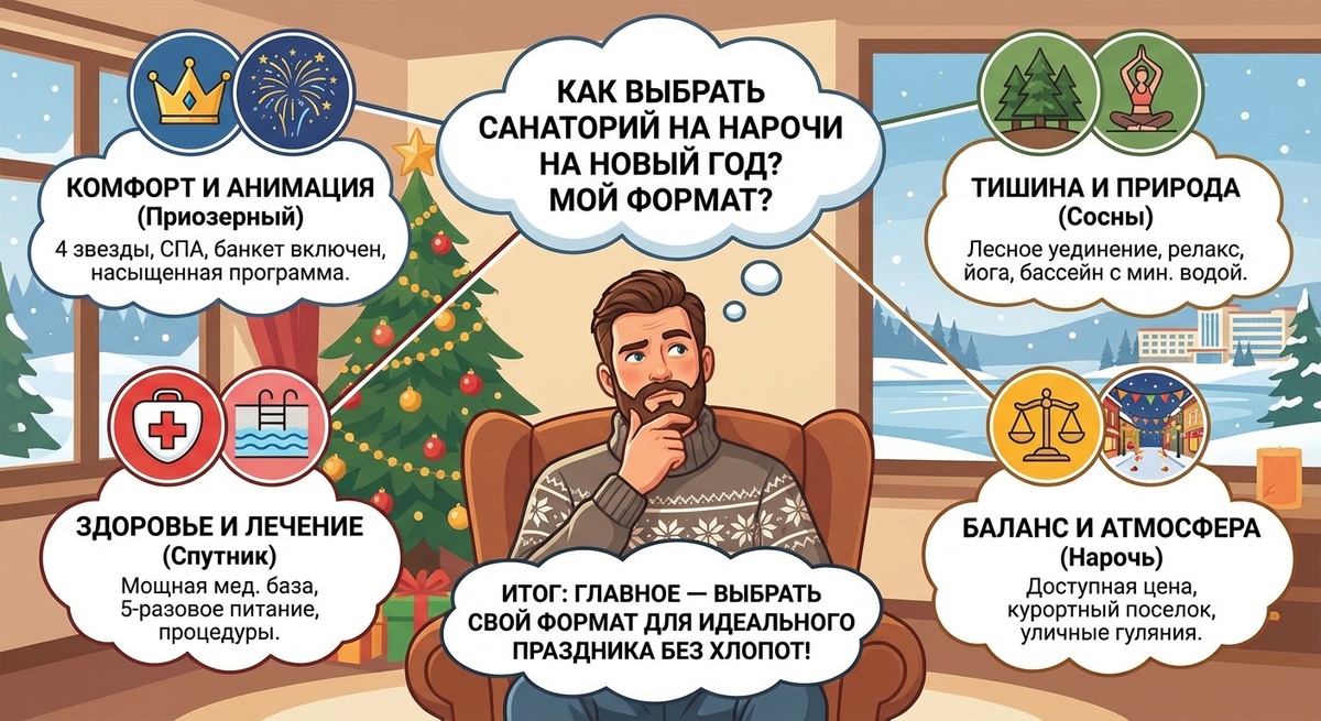 Приозерный и Сосны попадают в категорию премиум за счет развитого СПА, продуманной анимации и зимних активностей. Нарочь, Спутник, Белая Русь и Нарочанка остаются более доступными по цене и подходят тем для кого в приоритете бюджет или серьезное лечение. Белая Русь выделяется самым коротким минимальным заездом в 6 суток. Новогодний санаторный отдых на озере Нарочь снимает типичные страхи праздников усталость от готовки, набор лишних килограммов, тревогу за то как перенесут ночь родители или маленькие дети. А возможность первого января пойти на массаж или в бассейн вместо того чтобы лежать с головной болью делает этот формат все более популярным среди тех кто ценит свое время и здоровье.