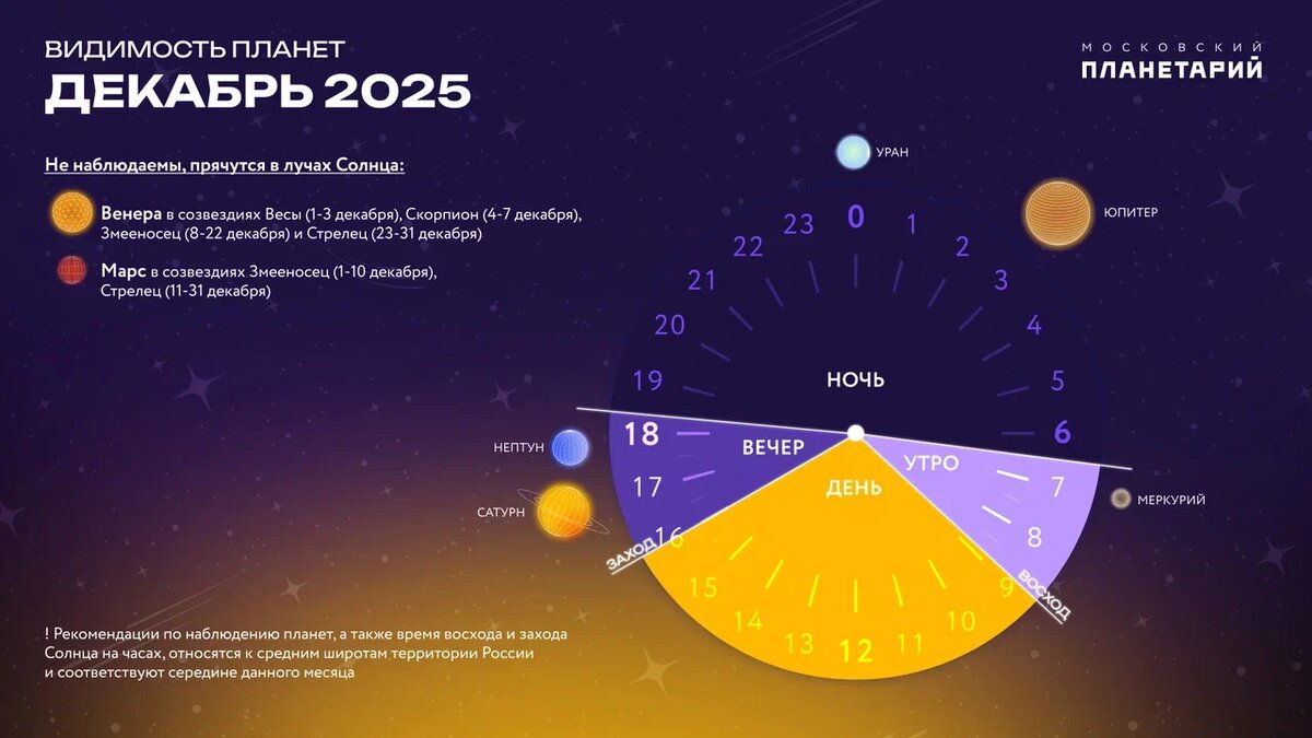 Вечер: Сатурн в созвездии Водолей (1-31). Нептун в созвездии Рыбы (1-31). Ночью: Юпитер в созвездии Близнецы (1-31). Уран в созвездии Телец (1-31). Утром: Меркурий в созвездиях Весы (1-14), Скорпион (15-17), Змееносец (16-30) и Стрелец (30-31). Не наблюдаемы, прячутся в лучах Солнца: Венера в созвездиях Весы (1-3), Скорпион (4-7), Змееносец (8-22) и Стрелец (23-31). Марс в созвездиях Змееносец (1-10), Стрелец (11-31). Читать полный текст астрономического прогноза — https://planetarium-moscow.ru/blog/news/astronomicheskiy-prognoz-na-dekabr-2025-goda-36