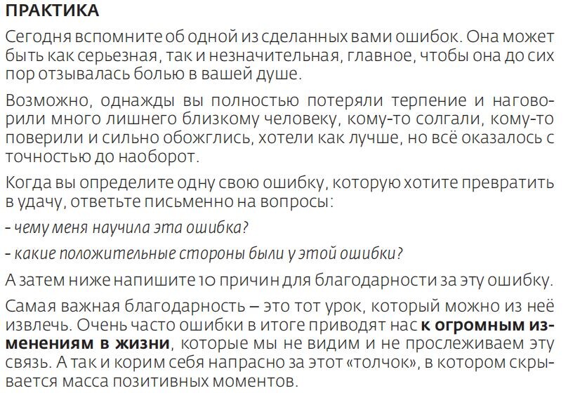 Практика: превращение ошибок в удачу ⤴️ 💛Каждая ошибка – скрытая удача, к которой есть бесценные уроки. В детстве мы учились ездить на велосипеде, падали, учились писать, ошибались – но знали, что тем самым оттачиваем своё мастерство и не останавливались. 💛 Повзрослев, отношение к ошибкам становится более критическим, мы их не терпим в других и злимся за них на себя. Но ведь без этих ошибок мы бы ничему не научились, не стали бы мудрее. 💛 Когда мы не берем ответственность за свои ошибки на себя, мы ничему не учимся, не развиваемся, не делаем выводы. Хуже того, через какое-то время мы снова повторим ту же ошибку. 💛 Абсолютно всем свойственно ошибаться, в этом нет ничего страшного. А сила благодарности за свой урок способна полностью избавить нас от совершенно напрасных страданий. Когда вы найдете достаточно много причин для благодарности, вы превратите ошибку в удачу. 💛 Если думать об ошибке как об ошибке – вы притяните ещё больше ошибок в свою жизнь. Если думать об ошибке как о