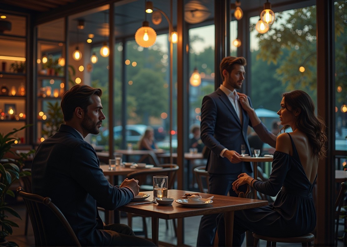 Сначала его зацепил интерьер: знакомое ему кафе в центре, с кирпичными стенами и высокими окнами. Потом взгляд зацепился за фигуру в глубине кадра — не в фокусе, чуть размытая. Девушка в тёмно-синем платье сидела боком, смеялась, прижимая к уху телефон.