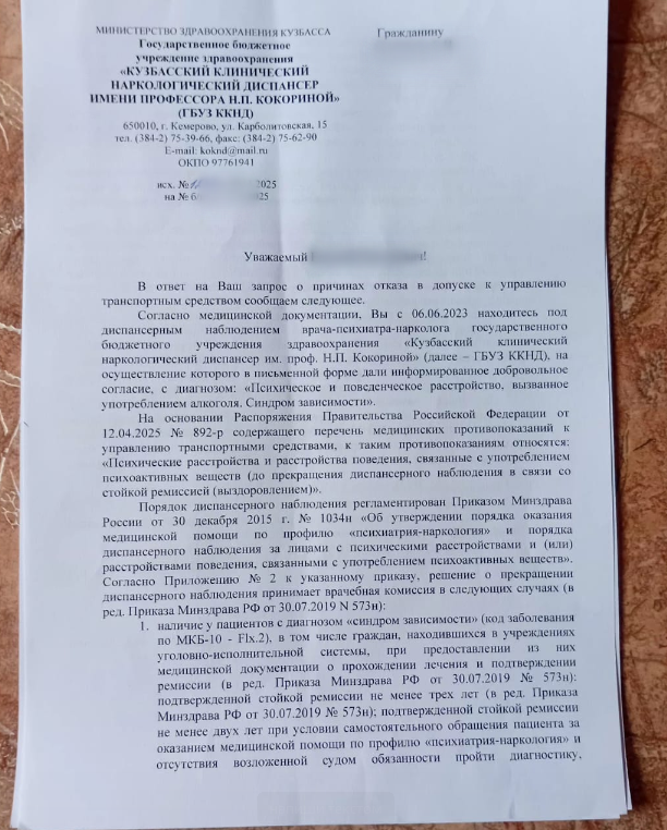 Согласно медицинской документации, Вы с 06.06.2023 находитесь под диспансерным наблюдением врача-психиатра-нарколога государственного бюджетного учреждения здравоохранения «Кузбасский клинический наркологический диспансер» И.П. Кокориной (далее – ГБУЗ ККНД), на основании которого в письменной форме было дано информированное добровольное согласие с диагнозом «Синдром зависимости и поведенческое расстройство, вызванное употреблением алкоголя». Диагноз был установлен Правительством Российской Федерации от 12.04.2025 № 892-р, содержащего перечень медицинских противопоказаний к управлению транспортными средствами.