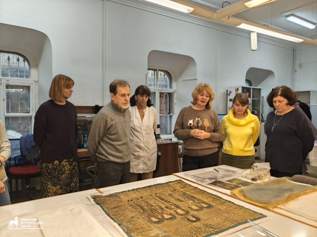 В Рязанском историко-архитектурном музее-заповеднике продолжается реставрация редкой шитой иконы «Избранные святые», созданной в XVI–XVII веках. Артефакт считается ценнейшим образцом древнерусского лицевого шитья. Об этом сообщили на странице музея. 20 ноября 2025 года в Москве состоялось заседание реставрационного совета отдела научной реставрации произведений прикладного искусства ГОСНИИР, на котором специалисты рассмотрели промежуточные результаты работ и утвердили дальнейшую программу. Реставратор Н. В. Син представила отчет и предложила необходимые материалы для продолжения восстановления. В частности, было решено провести дублирование на тонированный фатин, восполнить утраты фона каймы тонким газом и охристым некрученым шелком, а края укрепить тонированным шелком. Представленный план был одобрен единогласно. Завершить работы планируют к концу 2026 года. После обновления икона вновь станет одним из центральных экспонатов музея. Фото: Рязанский исторический музей.