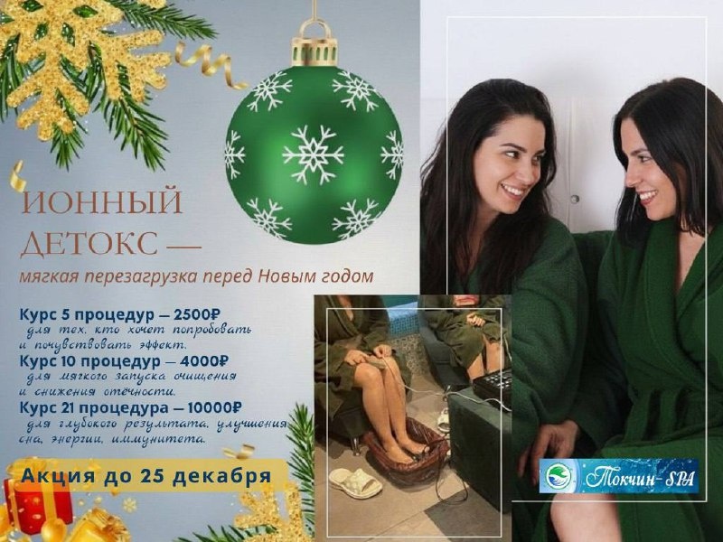 🌿 Ионный детокс — мягкая перезагрузка перед Новым годом Ты удивишься, насколько легче может быть твоё тело. Когда ионный детокс запускает очищение через стопы, организм будто делает глубокий выдох: уходит тяжесть, снижается отёчность, теплеют стопы, появляется ясность в голове и ощущение внутренней лёгкости. Это не агрессивная чистка — это естественная поддержка, без нагрузки на печень и почки. Уже после первой процедуры чувствуется, что тело оживает, а после курса результат закрепляется и становится стабильным. Сейчас лучшее время начать — действует акция до 25 декабря: 💧 Курс 5 процедур — 2500₽ для тех, кто хочет попробовать и почувствовать эффект. 💧 Курс 10 процедур — 4000₽ для мягкого запуска очищения и снижения отёчности. 💧 Курс 21 процедура — 7500₽ для глубокого результата, улучшения сна, энергии, иммунитета. Каждый курс работает одинаково качественно — разница только в глубине и длительности эффекта. Если хочешь понять, какой объём нужен именно тебе — напиши «детокс»,