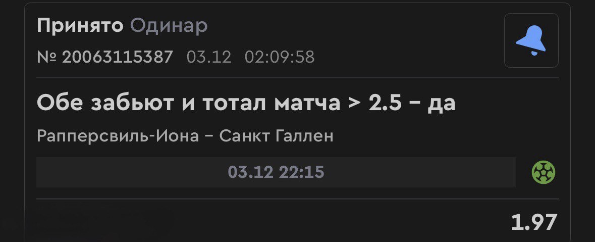 Номер два 🏋️♂️ тоже кубковый матч, но уже Швейцарии. ✅ Рапперсвиль - хозяева забивают в 10 матчах подряд. Даже в домашних поражениях (5 из 7 последних) они оставляют свой гол на табло. При этом Санкт-Галлен - сильный соперник, которому по силам забить в ответ ✅ Санкт-Галлен - команда показывает стабильную игру в атаке (1.7 гола в среднем за матч) и часто выигрывает второй тайм, они фавориты по коэффициентам и будут диктовать свою игру (но это неточно) ✅ Встреча без ничьих - последние 9 матчей Рапперсвиля и 12 домашних игр не заканчивались ничьей - это говорит об открытом футболе, где команды играют до конца, что часто приводит к тоталу больше 2.5. Формат Кубка и обе команды будут играть на победу, что увеличивает шансы на обоюдную результативность и общий тотал 😈 Кэф - достойный, почти 2 и по-этому забрал!