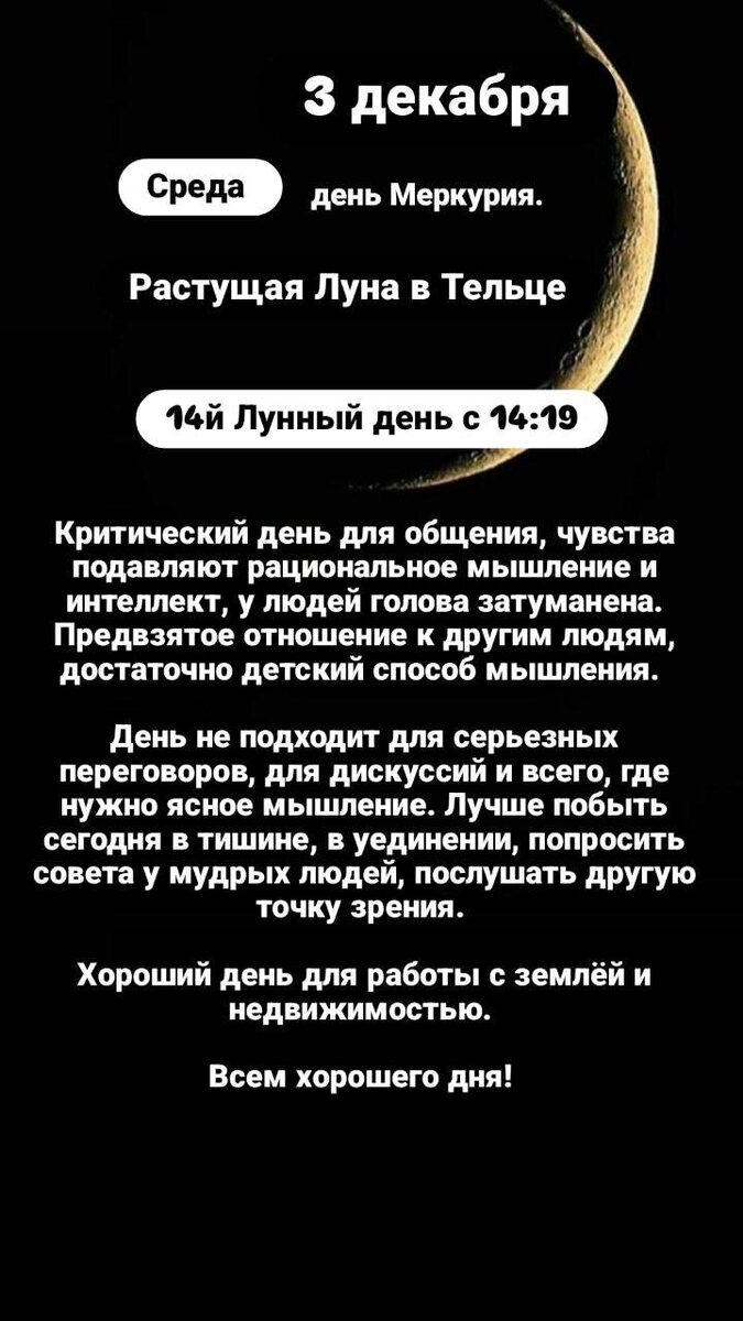 ▶️14 Лунный день с 14:19 Символ Труба. Очень мощный день, прорывной. ✅Если вы давно готовились к совершению решительного поступка, то этот день наилучшее время. ✅Не пропустите этот день: он исключительно удачен для начала любого важного дела. ✅Все начатое в эти сутки с блеском удаётся. Следующего такого шанса придётся ждать целый месяц. ✅День влияния грядущего Полнолуния, потому некоторые практики Полнолуния можно начинать проводить в этот день. ✅Очень хороша работа с растениями, цветами, травами на наведение негатива, особенно на одиночество и на сексуальные расстройства. ✅Любовные ритуалы и ритуалы на деньги будут иметь удачное продолжение. ❗️Магические практики и посещение кладбищ в этот день требуют особой осторожности. ❗️Для новичков проведение всех обрядов в этот день требует обязательной последующей чистки огнём и водой. 👍Запрещена любая работа с водой и с жидкостями вообще.