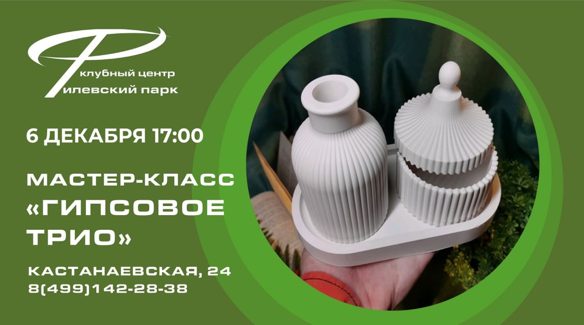 Творческая мастерская "Сделано.RUками" приглашает на уютный творческий вечер! 🎨✨ Создадим вместе подарочное гипсовое трио — стильный набор из подноса, вазы и шкатулки (или подсвечника — выбор за вами!). На мастер-классе вас ждет: 🔄 Пошаговое создание трех изделий из гипса 🎨 Различные техники окрашивания на выбор ☕️ Чай/кофе и сладости — пока гипс застывает 📦 Все необходимые материалы предоставляем Идеальный формат для: • Создания уникальных подарков близким • Освоения работы с гипсом • Приятного творческого вечера 🗓 6 декабря (суббота) в 17:00 📍 ул. Кастанаевская, 24 (м. Багратионовская/Филевский парк) 📞 8(499)142-28-38 Билеты и запись: 👉 https://tickets.afisha.ru/wl/2835/api#/about/137549 Подходит и подросткам, и взрослым. Унесете домой готовый набор и массу приятных впечатлений! 🎁 Все мастер-классы в нашей творческой мастерской "Сделано.RUками" 💫 по ссылке: https://vk.cc/ctdyMR #СделаноRUками Сайт • ВКонтакте • Задать вопрос • Запись в студию • Сделано.RU