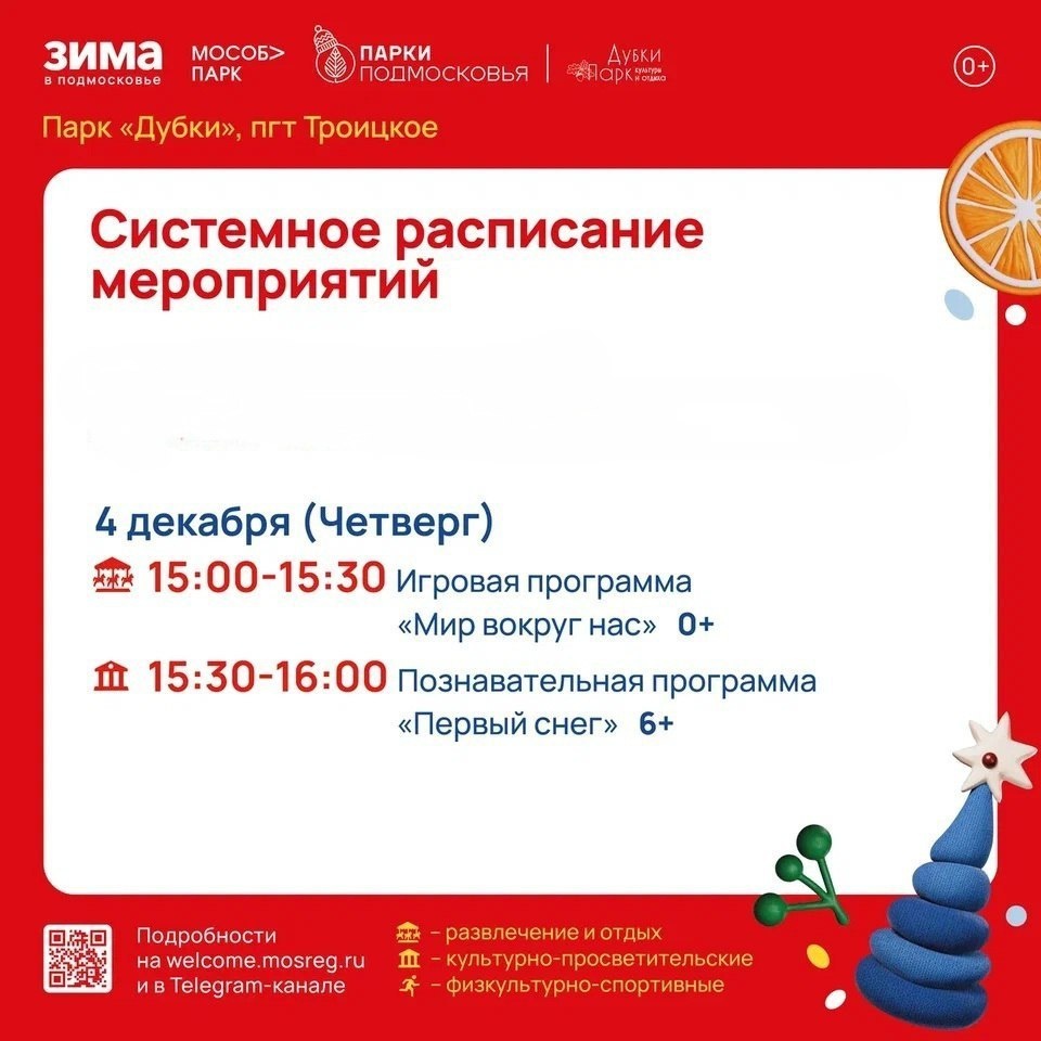 ✨ В четверг заглянем в парк Дубки с. Троицкое 👉15:00–15:30 — Игровая программа «Мир вокруг нас», 0+ 👉15:30–16:00 — Познавательная программа «Первый снег», 6+ 📆 04.12.2025 🏢 Парк культуры и отдыха «Дубки» 📍 г.о.Чехов, с.Троицкое, парк "Дубки" ⭐Поддержать канал голосом ✅ Мероприятия Чехов https://dzen.ru/id/66cc4b48e9ef144699238a51 http://vk.com/chekhov_events http://dzen.ru/chekhov_events