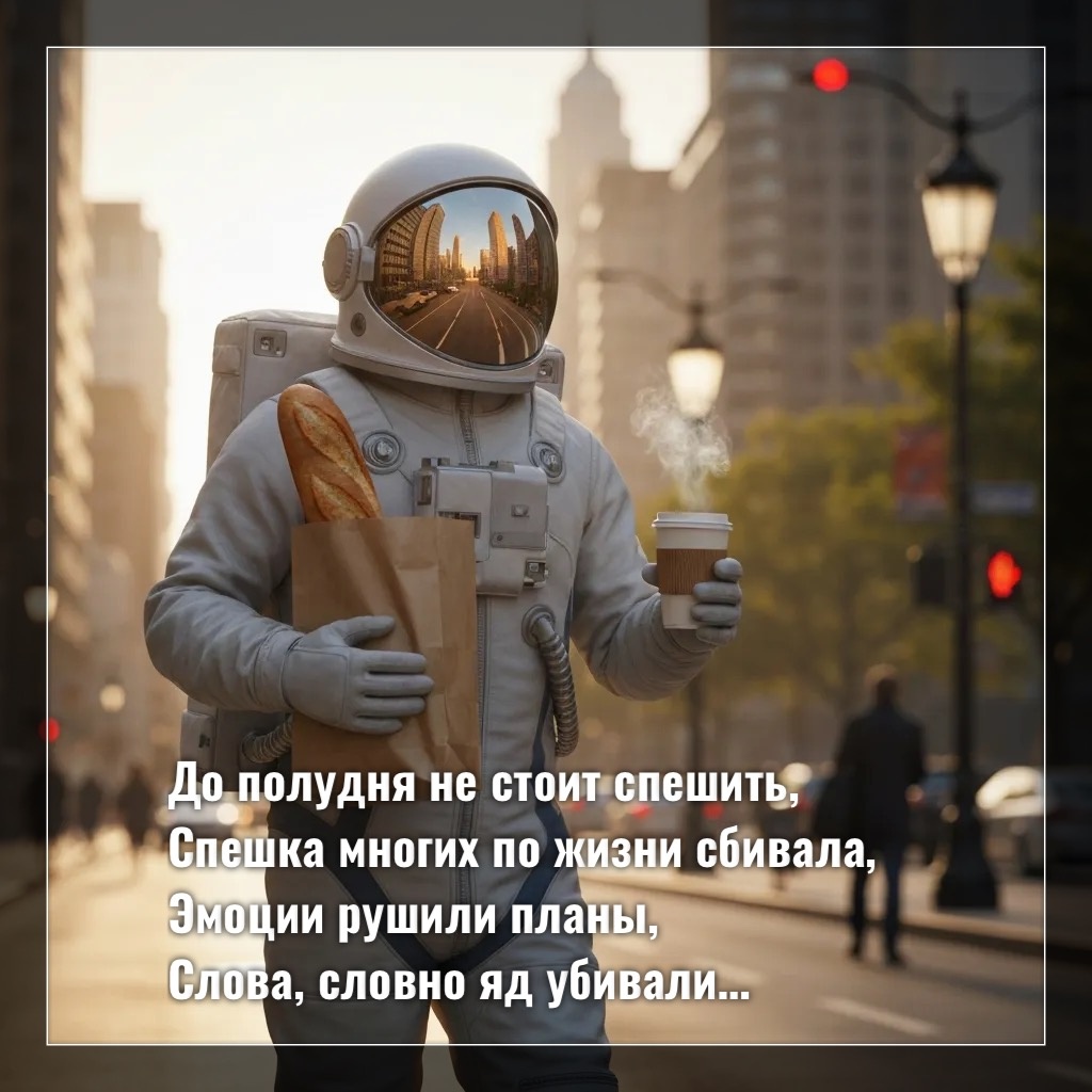 До полудня не стоит спешить, Спешка многих по жизни сбивала, Эмоции рушили планы, Слова, словно яд убивали, А ты не спеши делать выводы, Всё время само покажет, Ты просто доверься Всевышнему, Тому, что Он в тишине скажет, Сегодня мир рушиться может, А завтра увидишь вновь Небо, Чистое, без облаков, Внутри вдруг прольётся нега, Заботы все станут пушинкой, Исчезнувшими за мгновение, Поймешь, что ты зря беспокоился, Вернётся к тебе вдохновение, Вернутся твои все слова, Что раньше другим говорил, Всё, о чём ты мечтал, Бог в твою жизнь претворил, Думай о том, что думаешь, Следи за тем, что ты желаешь, Всё это исчезнет когда-то, Но ты всё равно пожинаешь Плоды все своих поступков, Действий и обещаний, Правды или притворства, Полученных в жизни знаний, Только ты не заиграйся, Старайся быть здесь, а не в мыслях, Чтоб не жалеть через время О своей бренной жизни.