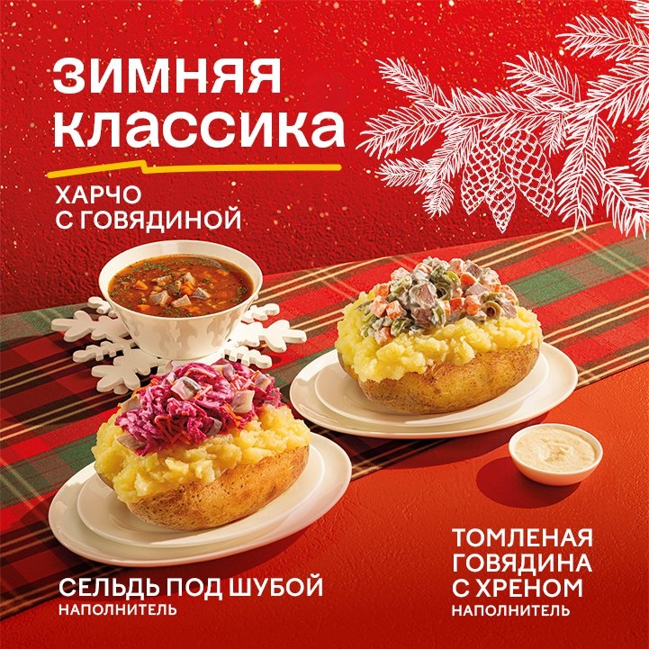 ❄️ ЗИМНЯЯ КЛАССИКА уже в Крошке Картошке! Готовы к самой уютной гастрономической зиме? ❄️✨ Три новых легенды на нашем зимнем столе: 🍲 Ароматный суп Харчо с говядиной — густой, наваристый, с говядиной. Немного остроты и согревающий аромат. Идеально против холода и усталости. 🥔 Наполнитель «Сельдь под шубой» — вкус праздника! Тот самый, из детства. Мы сохранили всю магию любимого салата. 🥔 Наполнитель «Томлёная говядина с хреном» — наша вариация всеми любимого оливье с нежной говядиной и пикантной ноткой хрена Приходите пробовать, греться и наслаждаться! Зима будет вкусной 😉