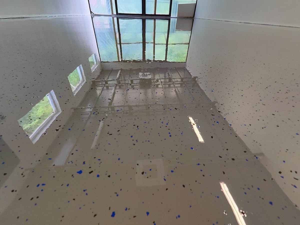 Как и любое другое полимерное покрытие, эпоксидный наливной пол требует тщательной подготовки основания — это особенность технологии. Он хорошо ложится только на ровный и сухой бетон. Если основание пылит, имеет трещины или повышенную влажность, покрытие может вздуться, покрыться пузырями или отслоиться. Это связано с принципом работы эпоксидных материалов: они плотно сцепляются с поверхностью и повторяют её дефекты.