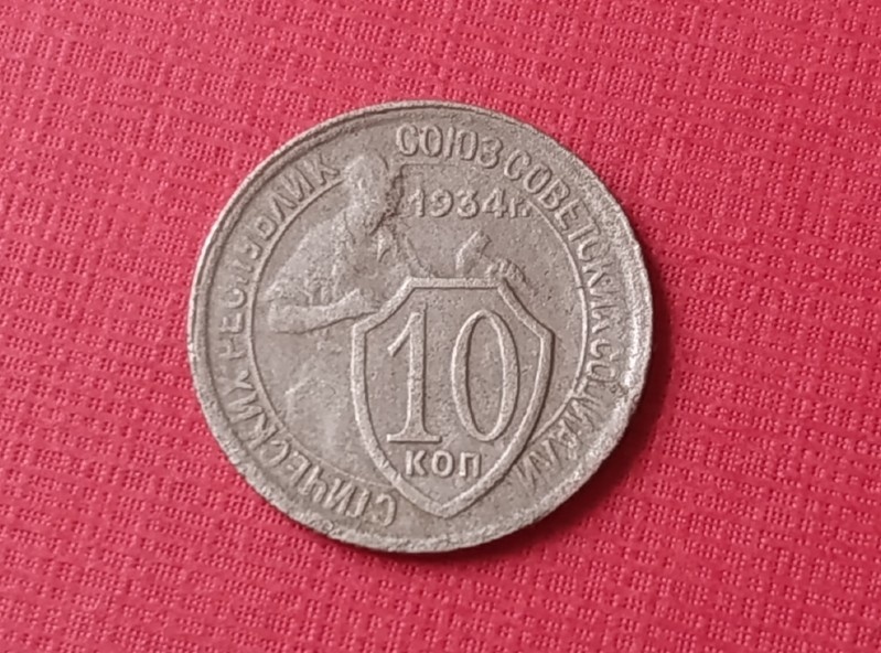 С 1931 по 1934 годы советские монеты номиналом 10 копеек (и не только они) чеканились с интересным оформлением. Реверс монеты был представлен изображением рабочего со щитом. Но потом оформление медно-никелевых монет решили переделать, вернуть к одному виду с бронзовыми монетами. А в данной публикации давайте поговорим про монету 10 копеек 1934 года. Среди монет-"щитовиков" этого номинала год 1934 является самым редким. У меня в альбоме лежит вот такая монетка: Как видно по её состоянию - она повидала жизнь. Но всё же нельзя сказать, что монетка совсем плохая. Если бы не слегка рыхловатое поле, то можно было бы назвать монету вполне нормальной. Информации о тиражах советских монет нет. Вернее сказать, цифры есть, но они не отражают количество монет определенного года, они просто лишь отражают количество "отгруженных" монет с монетного двора (и это могут монеты "смежных" годов). К примеру, монеты 1931-1934 годов имеют такие цифры тиражей (в миллионах штук): 1931 - 122, 1932 - 171,