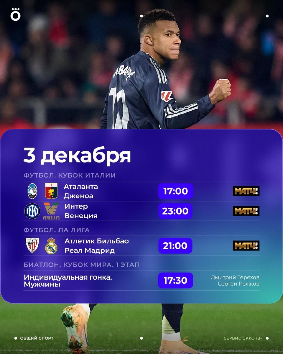 Кубок Италии, Ла Лига и Кубок мира по биатлону — такой план на сегодня 👍 В эту среду посмотрим кубковые матчи «Аталанты» и «Интера», а также узнаем, сможет ли «Реал» прервать ничейную серию в Примере. И не забываем про биатлон — сегодня состоится мужская индивидуалка 🔝 😄 Весь спорт в Okko: https://okko.tv/s/4ot