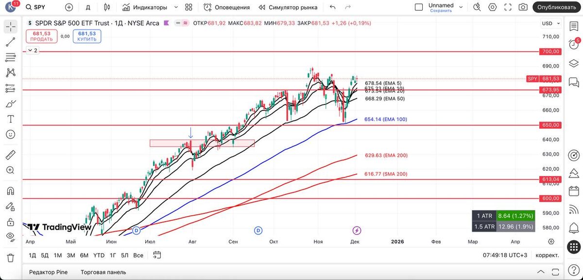 ВЫВОД: практически ничего нового. В данный момент мы видим слабость ротационных отраслей $RSP, $NYA, $RUT и снижение широты — однако это никак не влияет на $SPY = позитивно. Также в текущий момент наблюдаем силу техов и полупроводников $QQQ и $SMH = переменная ротация секторов, и цена продолжает удерживаться у локального максимума, и подтягивает быстрые скользящие (боковой пулбэк) = всё это признаки «бычьего» рынка. Продолжаем действовать в направлении тренда, защищая свой капитал. #spy #технический_анализ #америка #трейдинг_сша #фондовый_рынок #обзор #вывод #qqq #vix #smh #mags #xlk #ixic