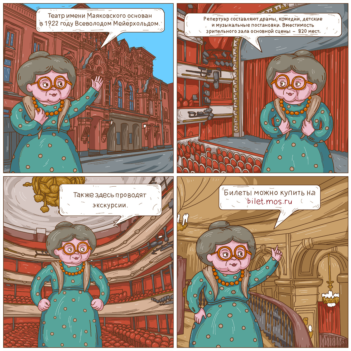 Сайт театра: https://www.mayakovsky.ru/ Театр ведёт свою историю с 1922 года, когда Всеволод Мейерхольд создал «Театр Революции». Но его труппа сформировалась на основе ещё более ранней «Театра РСФСР-1», который, в свою очередь, вырос из труппы немого кино. В 1990 году в здании театра случился сильный пожар, уничтоживший сцену и зрительный зал. Восстановление заняло почти 10 лет. Этот катастрофический период стал временем переосмысления. После реконструкции здание стало не только современным, но и прозрачным: фасад зрительного зала со стороны Триумфальной площади представляет собой огромную стеклянную стену. Прохожие могут видеть игру актёров изнутри, а зрители во время антракта панораму площади. Само здание является объектом культурного наследия.