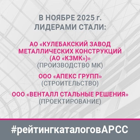 Каждый месяц АРСС публикует рейтинг наиболее просматриваемых компаний в каталогах производителей металлоконструкций, строительно-монтажных организаций и реестре проектировщиков. ✅По итогам ноября 2025 года в ТОП-5 каждого каталога вошли следующие компании: 📍Каталог производителей металлоконструкций 1️⃣ место занимает АО «Кулебакский ЗМК» (КЗМК) 2️⃣ место - ООО «Канский завод легких металлоконструкций «МАЯК» 3️⃣ место — ООО «Профлист-С ("Стальнофф")» 4️⃣ место — ООО «Тихвинский завод строительных металлических конструкций (ТЗСМК)» 5️⃣ место — ООО «Орский завод металлоконструкций» 📍Каталог строительно-монтажных организаций 1️⃣ место в рейтинге ООО «Апекс Групп» 2️⃣ место — АО «Уралметаллургмонтаж 2 (УММ 2)» 3️⃣ место — АО «ПРОКАТМОНТАЖ» 4️⃣ место — ООО «Строительная компания Титан» 5️⃣ место — ПАО «Северсталь Центр Домнаремонт 📍Реестр проектных организаций 1️⃣ место — вновь занимает ООО «Венталл Стальные Решения» 2️⃣ место — ООО «МетПромСтрой» 3️⃣ место — ООО «ЦентрГрадПроект» 4️⃣