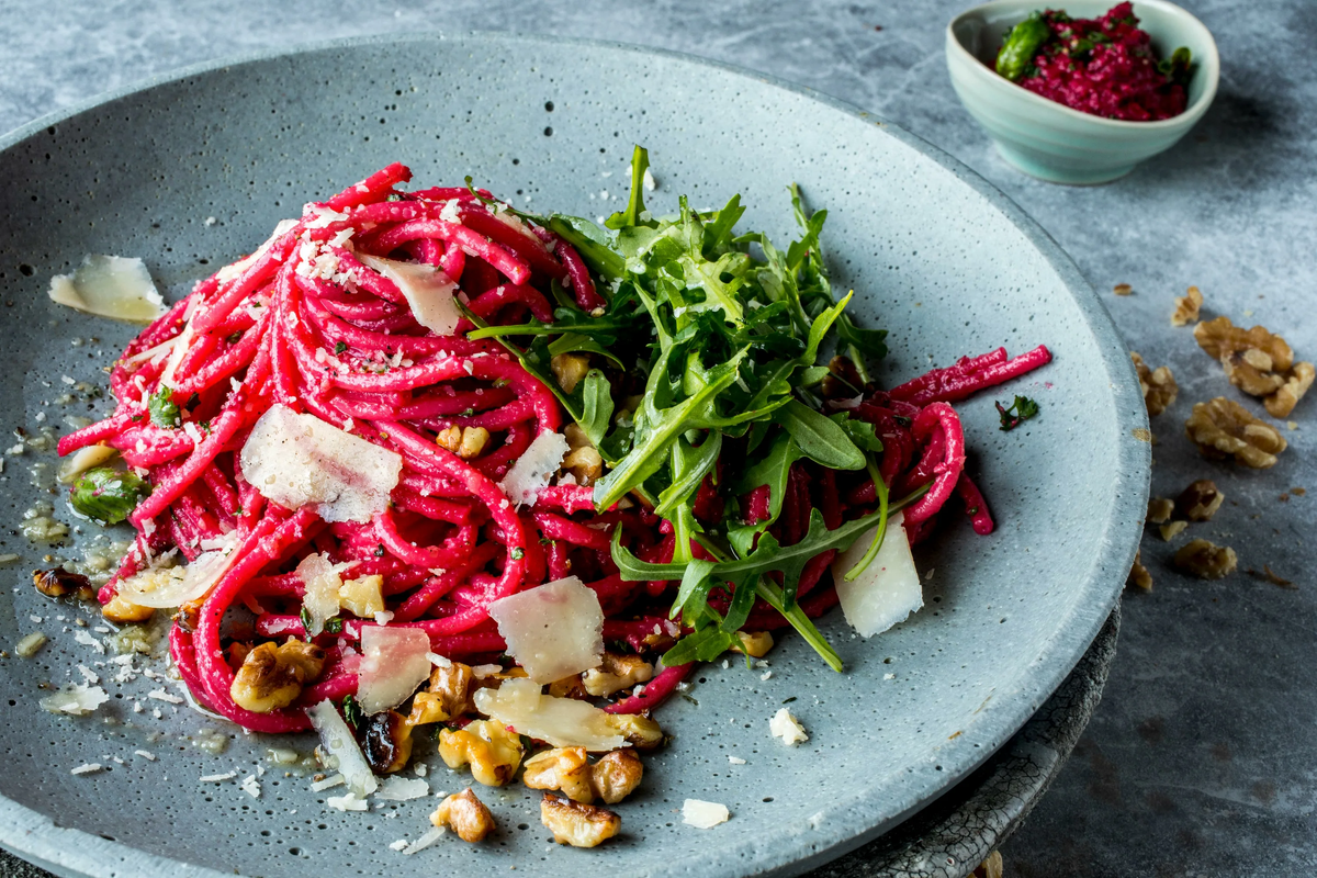 у свеклы масса полезных для человека свойств: свекольный сок снижает давление, нормализует работу кишечника и способствует кроветворению благодаря высокому содержанию железа. Также в ней много йода, магния, калия и витаминов. И при таком богатом составе и пользе этот «суперфуд» не стоит бешеных денег, а скромно лежит в любом овощном отделе магазина по самой невысокой цене. 1. Розовая паста со свеклой Ингредиенты: свекла - 2 шт. (готовим сами или покупаем готовую!!!) можно заменить мороженой черникой, цвет будет ярко фиолетовый ароматное оливковое масло (кунжутное масло) - 1 ст. л. свеклу можно не отваривать, а запекать: заверните неочищенный корнеплод в фольгу и запекайте в духовке при 180-200°С до мягкости – час-полтора, в зависимости от размера. В отличие от варки, при таком способе приготовления свекла не теряет свой сок и получается особенно вкусной. запеченную (или отварную) свеклу произвольно нарезаем и измельчаем блендером в гладкое пюре + 1 ст. л. ароматного оливкового