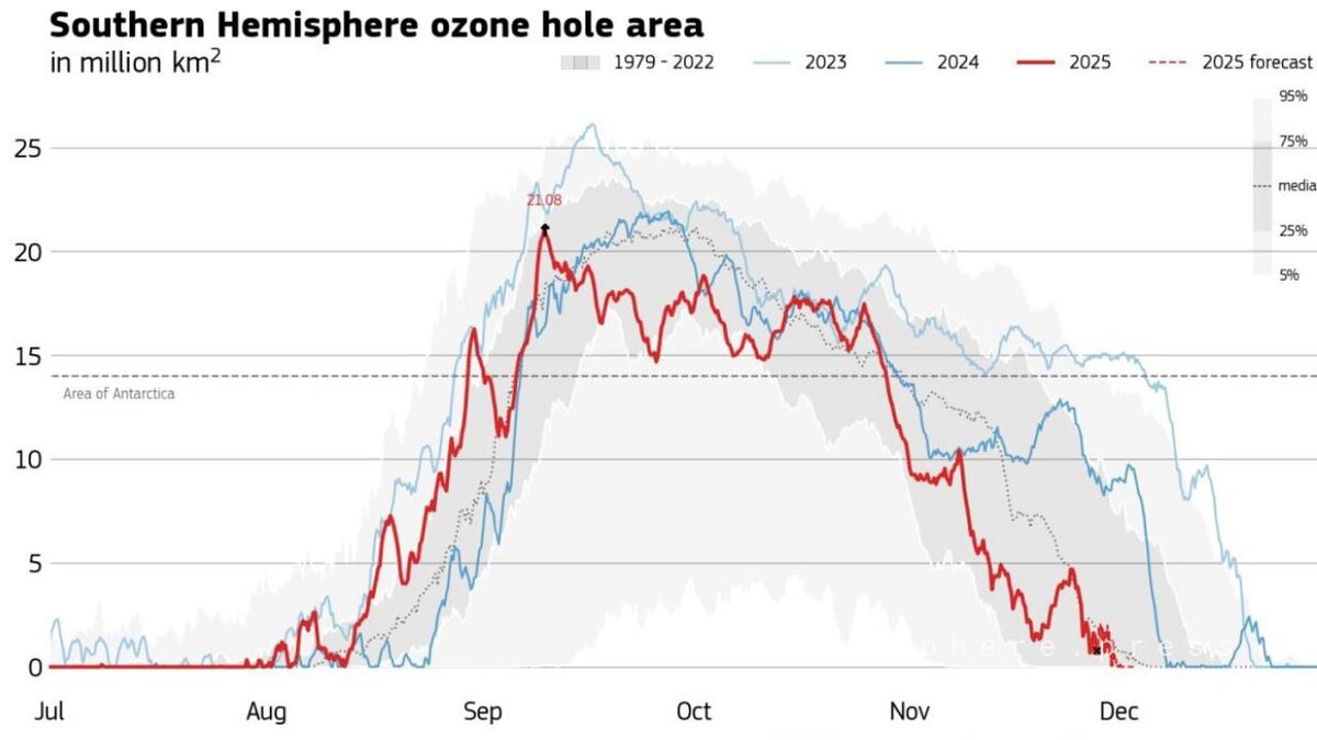 Второй год подряд природа дарит ученым осторожный оптимизм: озоновая дыра над Антарктикой, сформировавшаяся в 2025 году, полностью закрылась 1 декабря — это самое раннее исчезновение сезонной аномалии с 2019 года. По данным Европейской службы мониторинга атмосферы Copernicus Atmosphere Monitoring Service (CAMS), нынешняя озоновая дыра не только рано закрылась, но и отличалась относительно небольшими размерами и более высокой концентрацией озона по сравнению с масштабными и устойчивыми дырами периода 2020-2023 годов. Экосфера — о важном в экологии 🌿