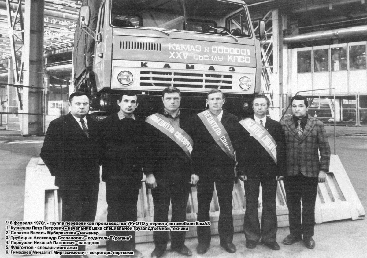 В Музее КАМАЗа хранится некоторое количество чёрно-белых фотографий, на которых запечатлены работники Камского автозавода на фоне первого автомобиля КАМАЗ. Работники управления главного энергетика КАМАЗа. Работники завода двигателей. Технологи КАМАЗа. Работники автомобильного завода. Комсомольские работники КАМАЗа. И на обороте этих фотографий значится такая надпись. Когда же сделаны эти парадные фотографии? Смею предположить, что уже после торжественного митинга 16 февраля 1976 года, так как ни накануне, ни в день выпуска первого автомобиля организовать фотосъёмку камазовцев просто не было никакой возможности (накануне автомобили стояли на главном сборочном конвейере, а в исторический день на месте проведения митинга яблоку некуда было упасть от большого количества людей). Но по воспоминаниям очевидцев тех событий, новенькие камские грузовики, сразу после торжественного митинга 16 февраля 1976 года, вечером того же дня, своим ходом отправились в Москву в качестве трудового подарк