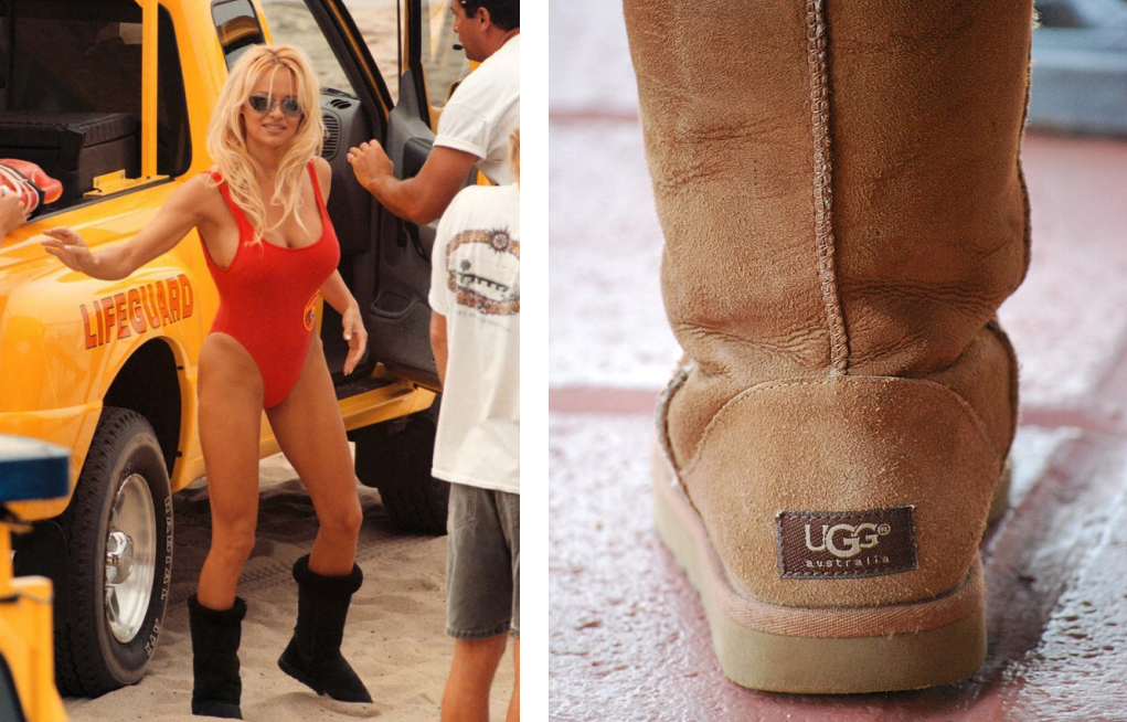 В 90-е — угги становятся модной фишкой для большинства актеров. Памела Андерсон, снимаясь в сериале «Спасатели Малибу», на пляже за кадром постоянно носила эту обувь. Актрису фотографировали папарацци и размещали контент в модных журналах и желтых газетенках. Как только изображения Андерсон попали в глянцевые журналы, так угги сразу стали символом, увеличив доходы компании, которая их производила.