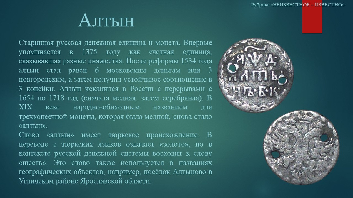 Рубрика "НЕИЗВЕСТНОЕ –ИЗВЕСТНО". Алтын – новое слово в нашей рубрике. На слайде фотографии аверса и реверса монеты из фондов Угличского музея. На аверсе в центре двуглавый орел с тремя коронами, скипетром и державой. На реверсе надпись в три строки. Вверху дата: "АѰД." (1704г.). Ниже номинал и обозначение монетного двора: "АЛТЫ/ НЪ. Б.К."(Большая казна). По краям монеты зубчатый ободок. #углич #угличскиймузей #угличскийкремль #алтын #монета #неизвестноеизвестно #uglich