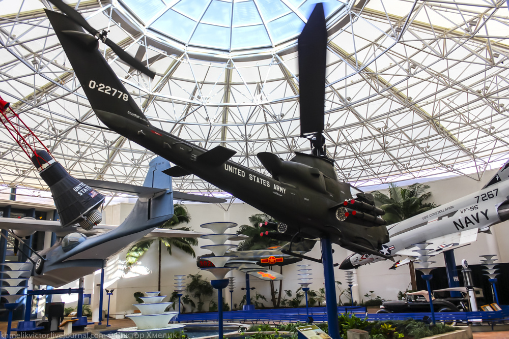 AH-1 Cobra или Huey Cobra был первым вертолётом, разработанным специально для ударных целей для армии США. Многоцелевой вертолёт Bell UH-1 Huey использовался во Вьетнамской войне всего несколько лет, прежде чем возникла необходимость в его вооружённых эскортных и лёгких ударных версиях. Сначала они модифицировали «Хьюи», добавив к существующему планёру пушечное и ракетное вооружение. Однако ограничения ранних модификаций вертолётов, в частности, их уязвимость к вражескому огню, потребовали перепроектирования планёра. Многоцелевой вертолёт «Хьюи» получил тонкий, низкопрофильный, обтекаемый планёр, который обеспечивал лучшую защиту экипажа и большую грузоподъёмность, а также увеличивал скорость. Этот новый проект получил название AH-1 Cobra. Двухлопастная несущая система «Кобры» издавала характерный «хлопающий звук», который успокаивал друзей и потенциально пугал врагов. Вертолёт «Кобра» — устойчивая платформа для вооружения, особенно для управляемых противотанковых ракет. Различные модификации «Кобры» до сих пор используются Корпусом морской пехоты США. Имеющийся в музее вертолёт AH-1E «Кобра» — это усовершенствованная версия AH-1S «Кобра», выпущенная в 1977 году и переданная армии в 1978 году. Он принимал участие в боевых действиях на Гренаде во время операции «Вспышка ярости» в 1983 году и в последний раз служил в 7-й лёгкой пехотной дивизии, базирующейся на базе Форт-Орд, штат Калифорния. Армия США передала этот вертолёт музею в 1993 году. Он представлен в павильоне авиации с ракетами, противотанковыми ракетами «Тоу» и трёхствольной 20-мм пушкой «Вулкан». Это вооружение было типичным для основной задачи «Кобры»: атаковать вражеские танки и боевую технику для поддержки наземных войск.