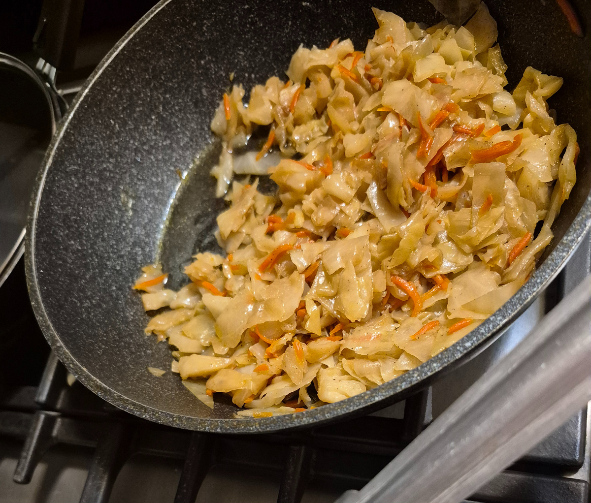 Нарезать квадратами капусту,натереть 1шт.моркови,нарезать луковицу, посолить и поперчить немного, налить растительного масла 3ст.л.и жарить на более сильном огне при открытой крышки, потом огонь убавить и влить чуть воды 2ст.л и потомить под крышкой 5мин,капустка объеденье.