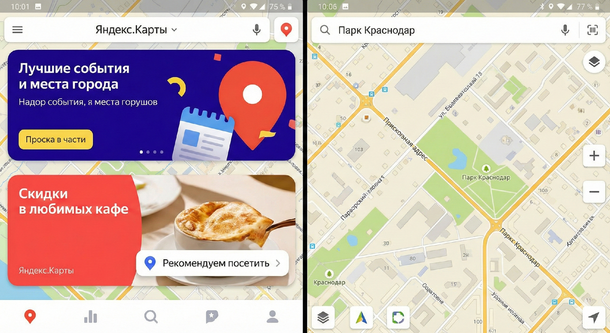 Выбор навигатора зависит от того, как именно вы передвигаетесь по городу: пешком, на машине или на общественном транспорте. В этом разборе мы сравним два самых популярных сервиса — 2ГИС и Яндекс.Карты — по ключевым параметрам, чтобы выяснить, какой из них лучше справляется со своими задачами. 1. Интерфейс и реклама Первое, что бросается в глаза при использовании Яндекс.Карт — это монетизация. Приложение активно зарабатывает на рекламе: рекомендации часто выскакивают при масштабировании карты, перекрывая обзор и отвлекая пользователя. 2ГИС в этом плане выигрывает: интерфейс здесь более комфортный, «чистый» и лишен навязчивых баннеров. Это подтверждают и отзывы в магазинах приложений, где рейтинг 2ГИС традиционно выше.