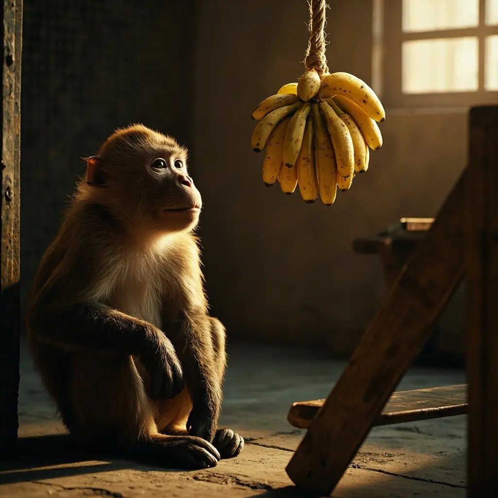 «В вольере находятся пять обезьян, посередине помещения стремянка, а сверху висит гроздь бананов. Время от времени одна из обезьян предпринимает попытку взобраться по стремянке и взять бананы. После этого всех остальных обезьян обдают холодной водой из брандспойта; остаётся сухой только та, что взяла бананы.